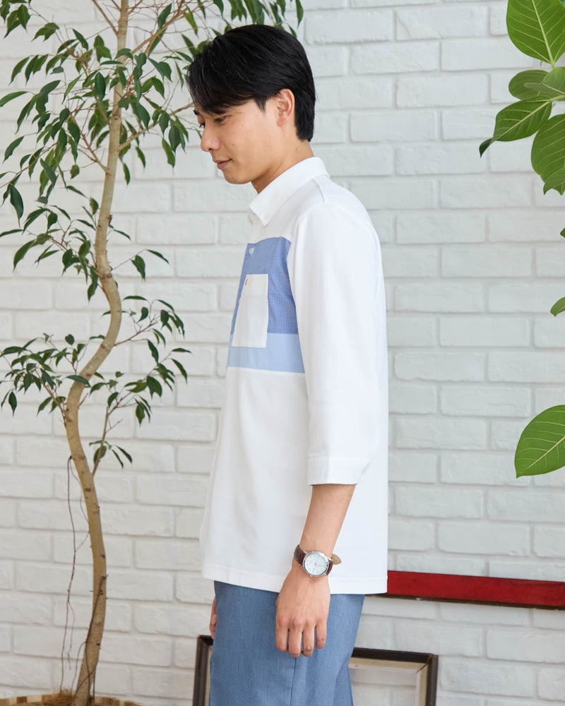 胸元に配したアシンメトリーな切り替えが、さりげなく個性を主張するフルオープン仕様のポロシャツです。一般的なプルオーバーとは一線を画すシャツのような佇まいで、毎日のコーディネートに新鮮なトラッドの風を吹き込んでくれます。フロントが全開になる設計は、汗をかいた際やヘアスタイルを崩したくない時でも、ストレスなくスムーズに着脱できるのが最大の魅力。機能的なだけでなく、ボタンの開け閉めでインナーとのレイヤードも自在に楽しめ、4月の爽やかな陽気から初夏まで、軽やかに、そして品よく日常に寄り添ってくれる、こだわりが詰まった一着です。