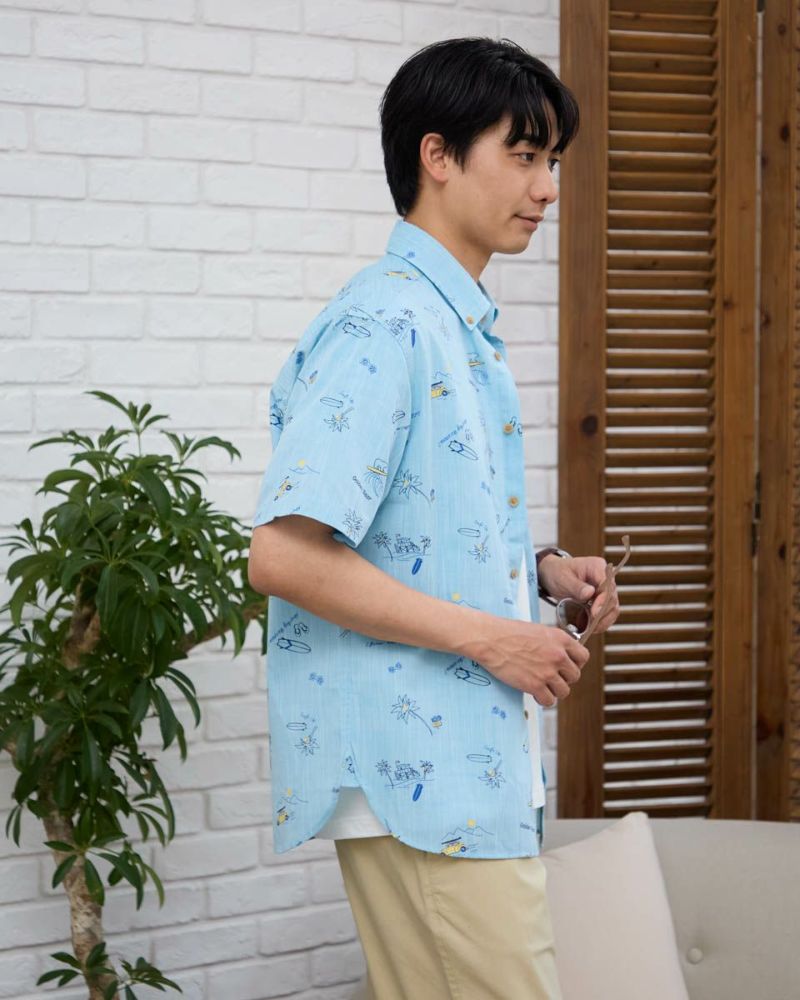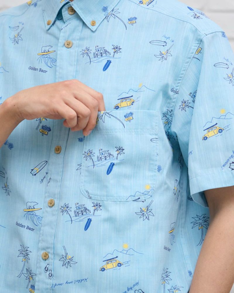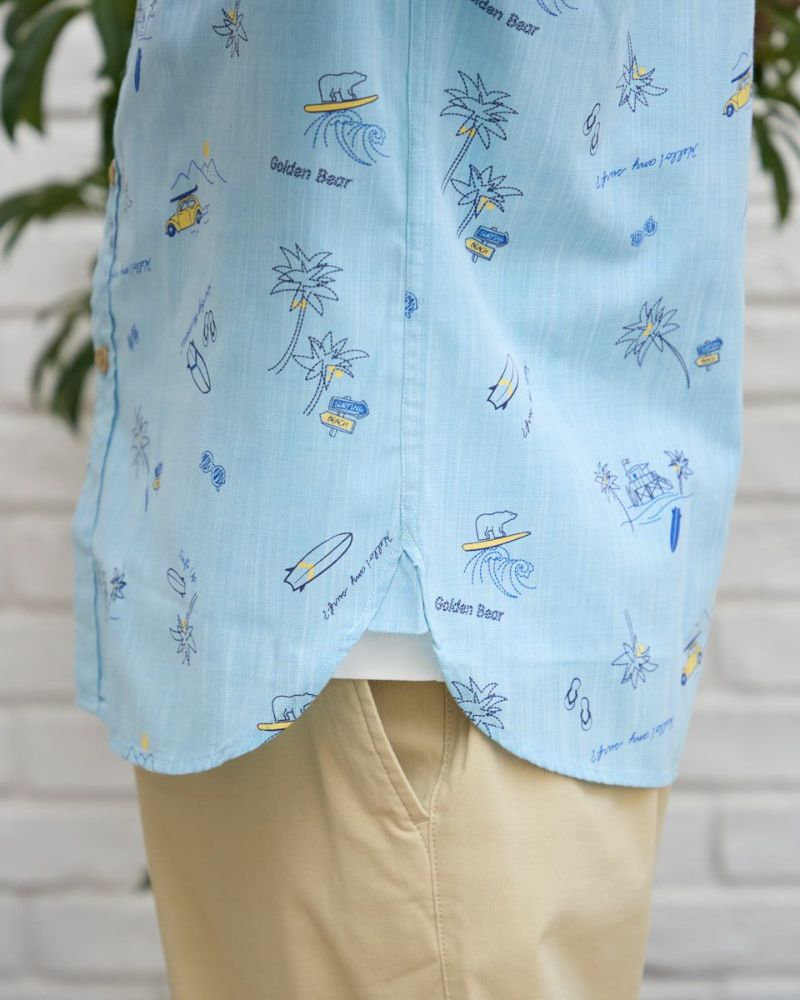 ボタンダウン襟のプリントシャツです。涼感のあるシャンブレー生地にサーフィンをモチーフにした楽しさを感じるプリントを施しました。大きめの胸のダブルポケットと幅広いヨーク切替、太めのステッチなどゆるい雰囲気に仕上げました。サイズ感もややゆったりとしたリラックスシルエットです。 モデル身長: 180 cm 着用サイズ: L サイズ 同デザイン通常サイズはこちら Golden Bear KING SIZE(Men's 大きいサイズ) シャツ (Men's)