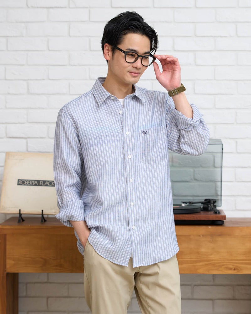 上質なフレンチリネンを100%使用し、特有の清涼感と柔らかな肌触りを存分に引き出したストライプシャツです。リネン素材ながら、イージーケア加工を施すことでシワになりにくく、ノーアイロンでも端正に着用できる高い実用性を備えました。顔映りの良いクリアな色合いと、コーディネートを選ばないバランスの良いストライプ幅が、日常のスタイルに清潔感あふれる彩りを添えてくれます。裾のラインや着丈を絶妙に調整することで、ボトムスにインしてもアウトにしても収まりが良く、綺麗めからカジュアルまで幅広いシーンで活躍する汎用性の高い一枚に仕上げました。シルエットは適度なゆとりを持たせたレギュラーフィット。デニムやスラックスにさらりと合わせるだけで、リネン本来のナチュラルな風合いが際立つ、洗練された大人のトラッドスタイルを叶えてくれます。