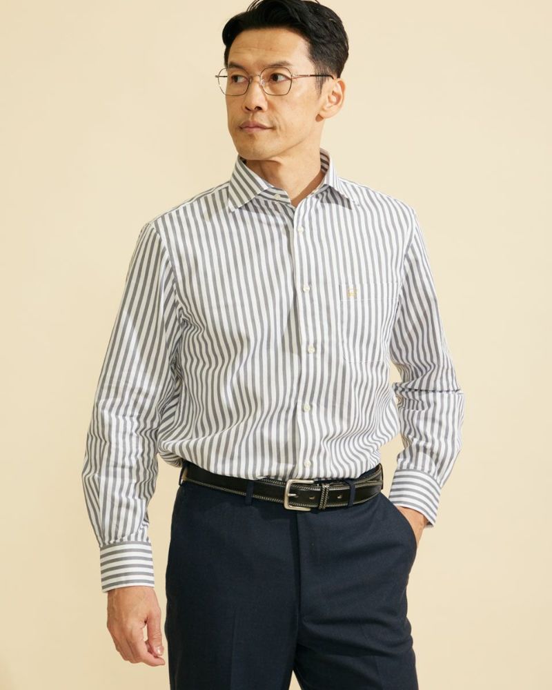トラッドスタイルとの相性抜群なロンドンストライプのワイドカラーシャツです。上品さを感じる細番手の糸を使用しています。柔らかく肌触りのよさが特長です。間隔の広いストライプはコーディネートのアクセントになるアイテムです。