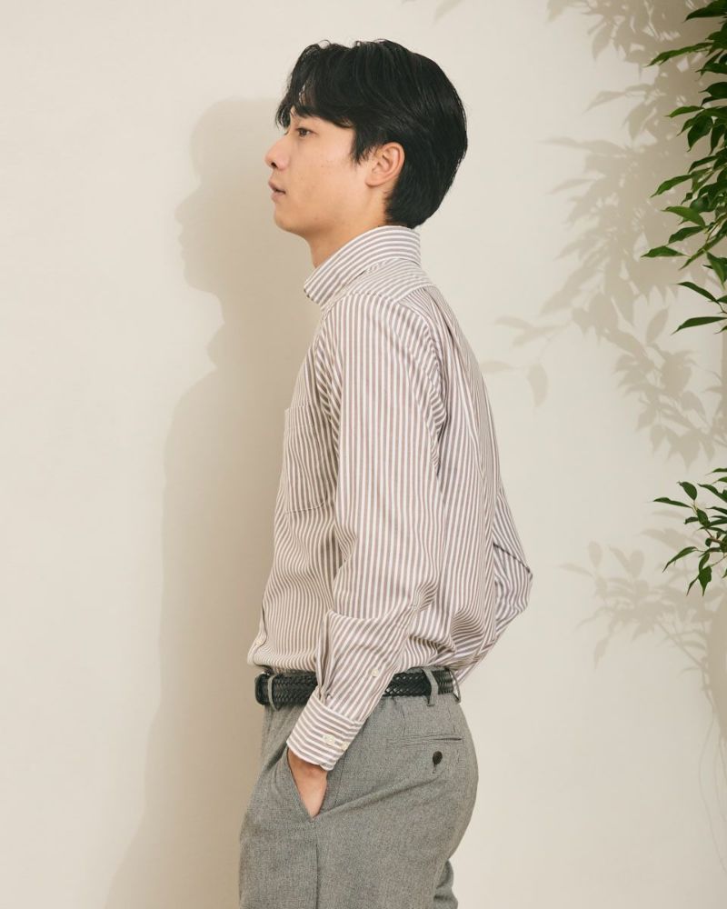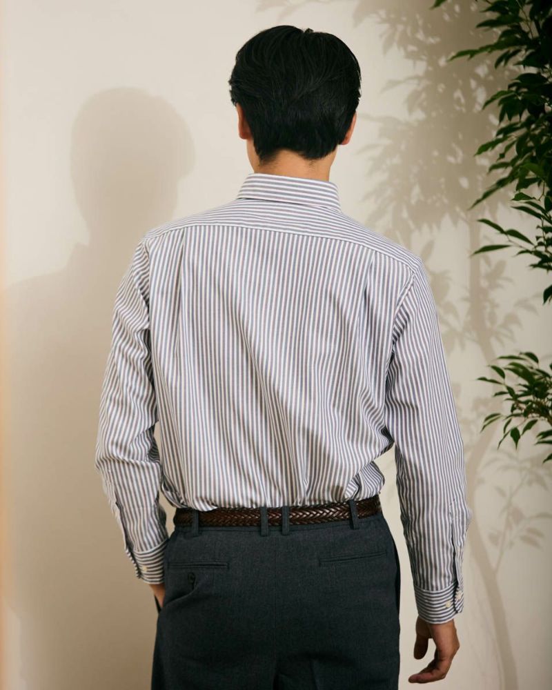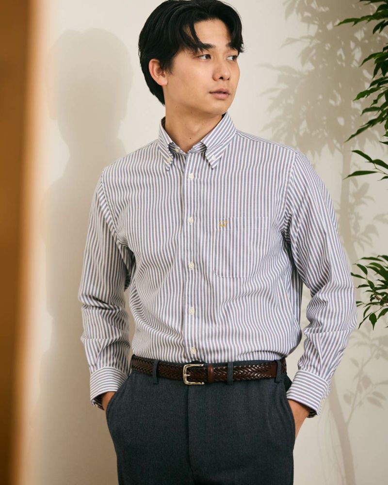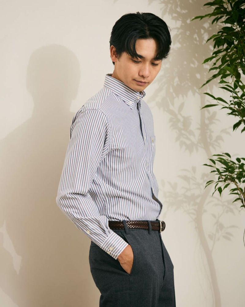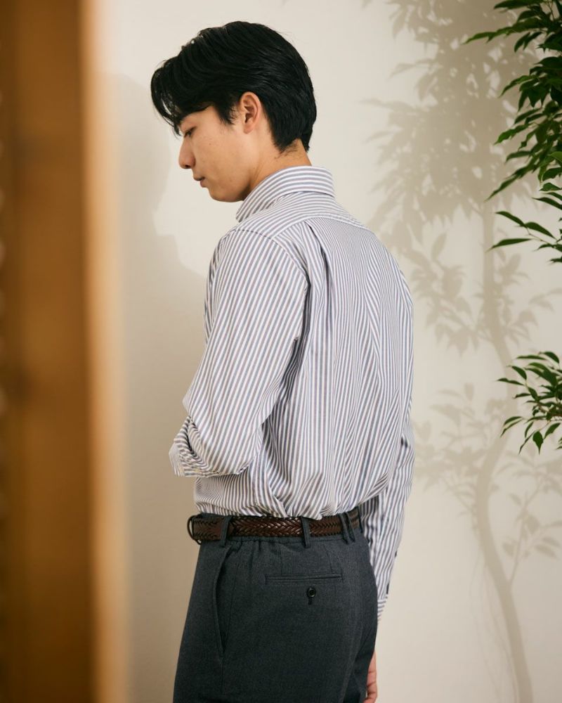 ストライプのボタンダウンカラーシャツです。柔らかな風合いの綿素材を使用しています。襟をロールの形状にすることで、ノーネクタイでも収まりのよさを追求。最上部のボタンを外した時も絶妙なバランスです!