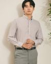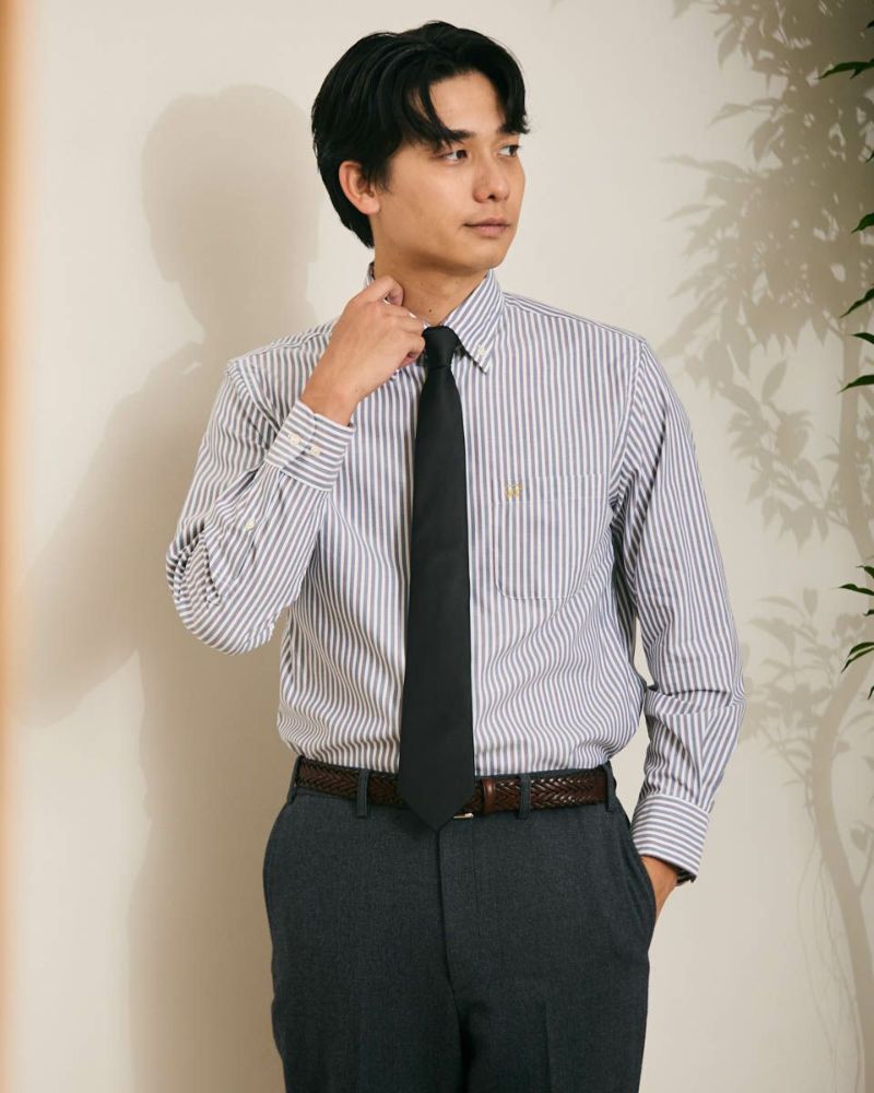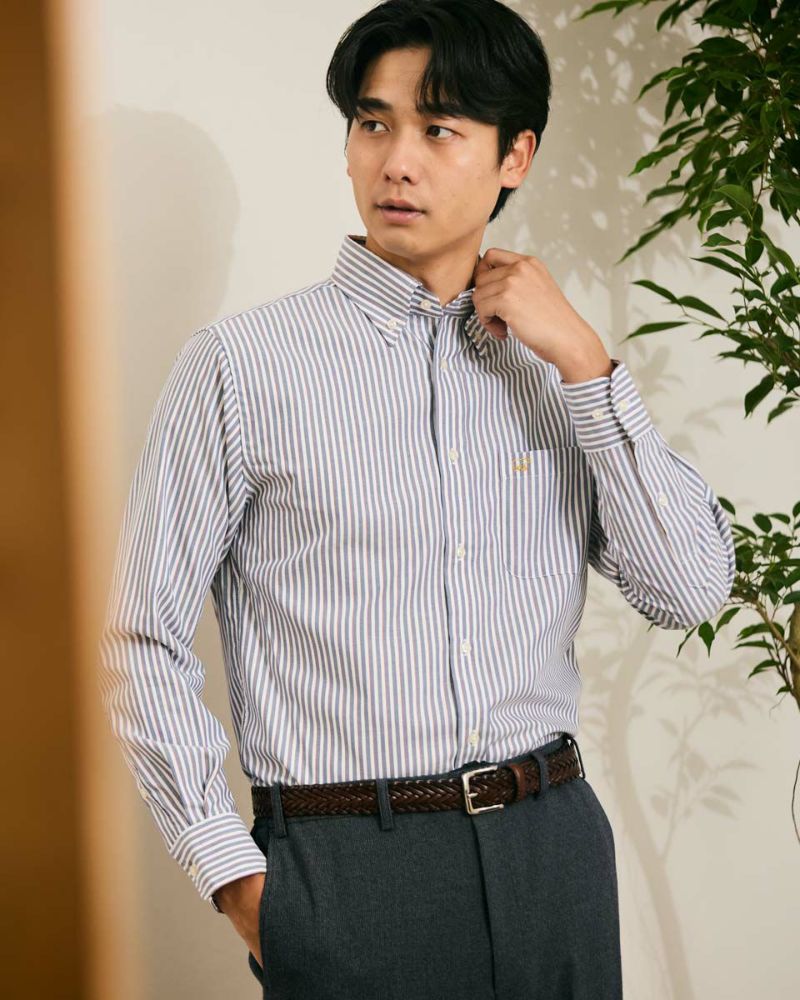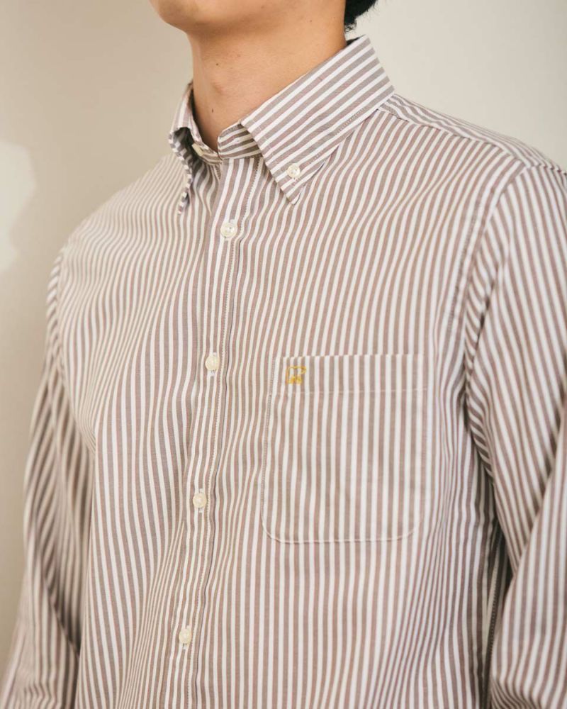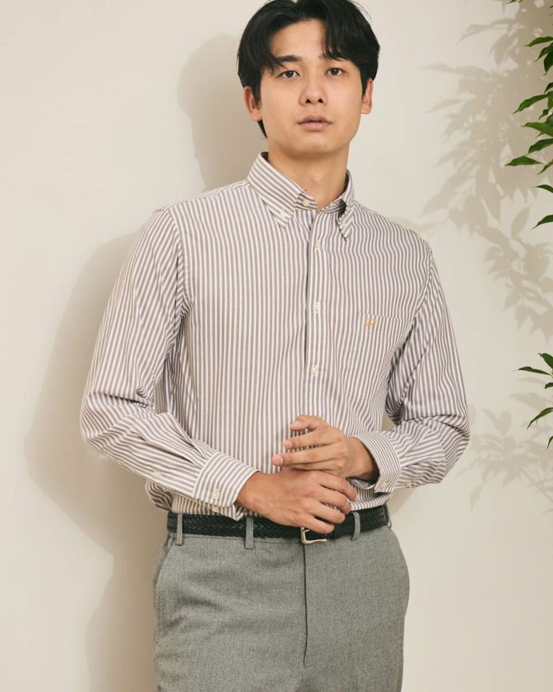 ストライプのボタンダウンカラーシャツです。柔らかな風合いの綿素材を使用しています。襟をロールの形状にすることで、ノーネクタイでも収まりのよさを追求。最上部のボタンを外した時も絶妙なバランスです!