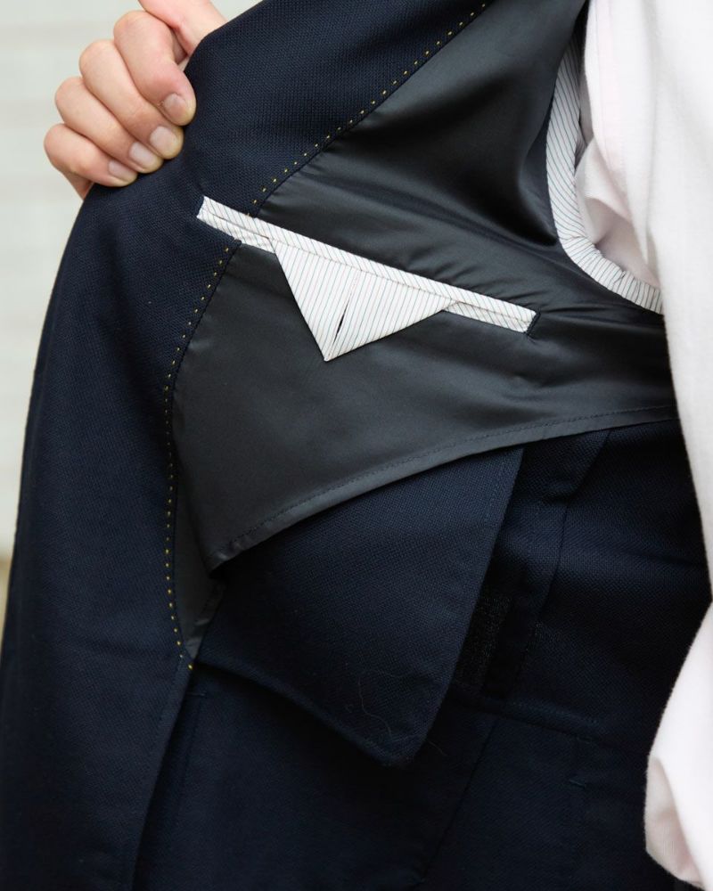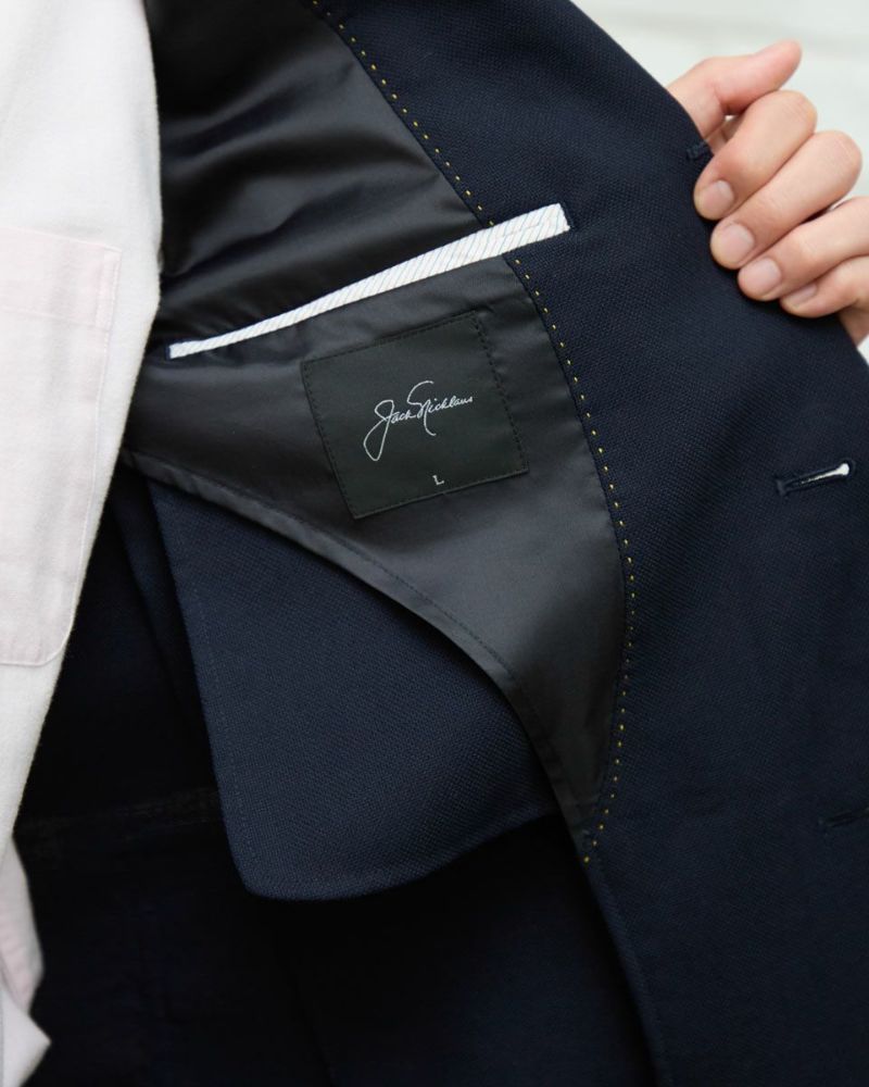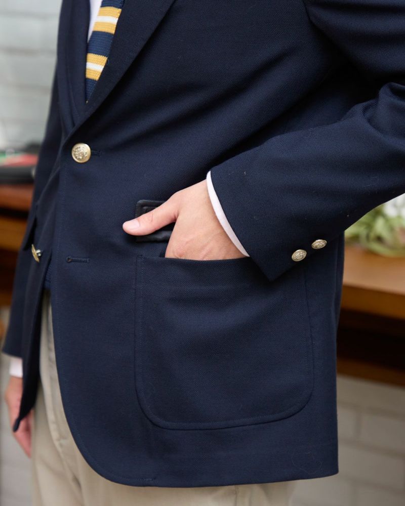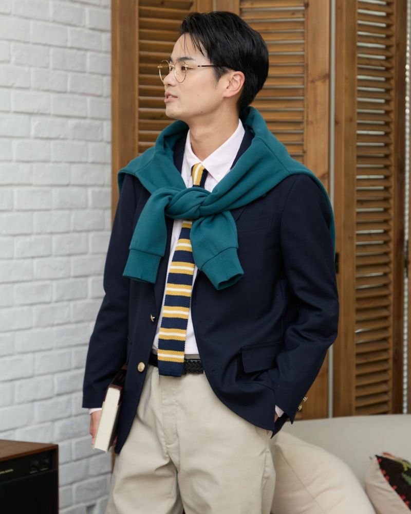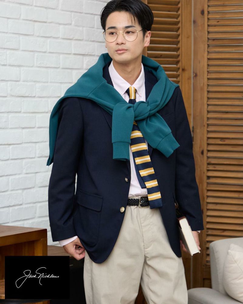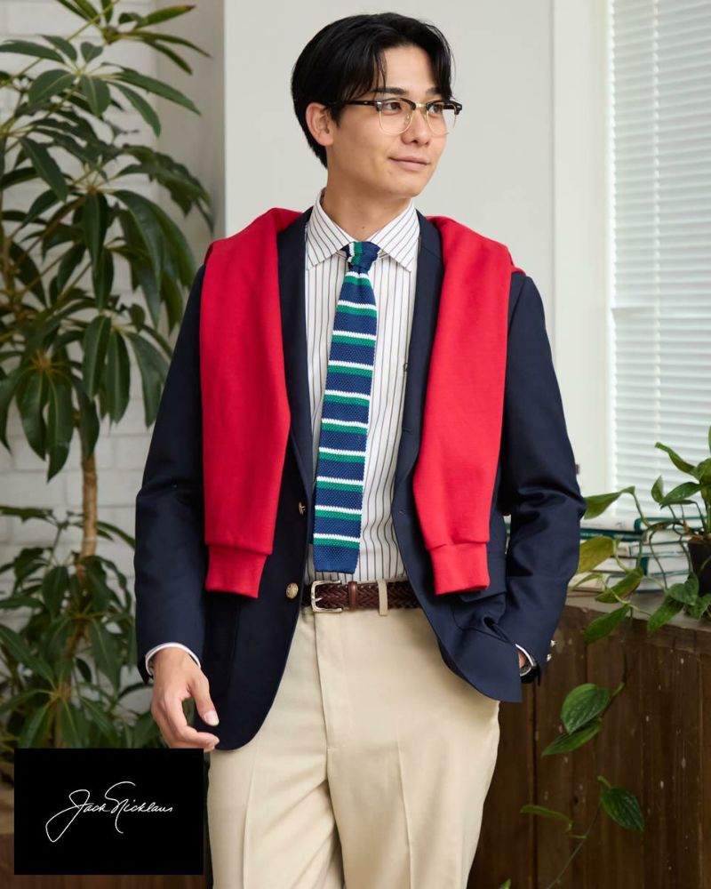 ザックリとした素材感のホップサック(ビールの原料であるホップを摘み取り運ぶための麻袋が由来)でつくったブレザーは、フォーマル過ぎず適度なカジュアル感を演出します。 パッチ&フラップポケット・金ボタン・段返りラペル・フックベント・ミシンステッチなど王道のアイビースタイルを踏襲したデザ インに仕上げました。ラペルを左右対称に落ち着き易くする為に、一番上をフェイクにした段返りデザインが他には無い特徴です。 モデル身長: 186・180・176 cm 着用サイズ: L サイズ Jack Nicklaus (Men's) アウター (Men's) 【着用アイテム】314RC070 ニットタイ 314RC204 ストライプシャツ 314RC230 オックスシャツ 314RC416 ハーフZIPスウェット 314R8703 超ストレッチイージーパンツ 314RC704 イージーパンツ 317RC701 イージースラックス