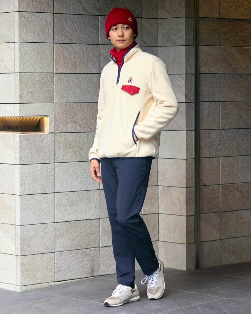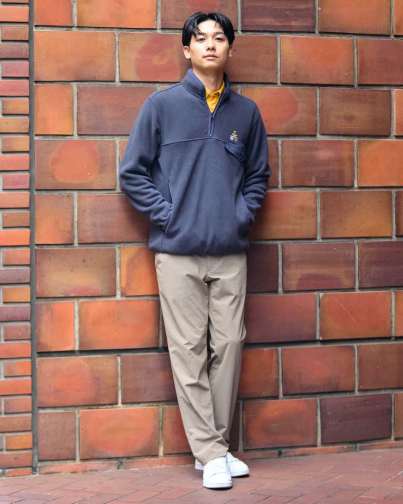 レトロでスポーティなハーフZIPスウェットです。フラップ付きのポケットやパイピング部分に配色を入れアクセントを効かせました。 アウトドアシーンにもオススメです。合わせるインナー・パンツを選ばない、万能アイテムです! モデル身長: 180 cm 着用サイズ: L サイズ GB GOLF カットソー (MEN) 【着用アイテム】 TOURタートルネック (品番: 312QD442 ) GBGスラックス (品番: 312QC703 ) GBGビーニー (品番: 312QD002 ) SPIKEポロシャツ (品番: 312QC452 )