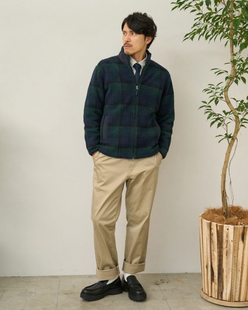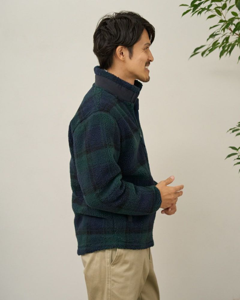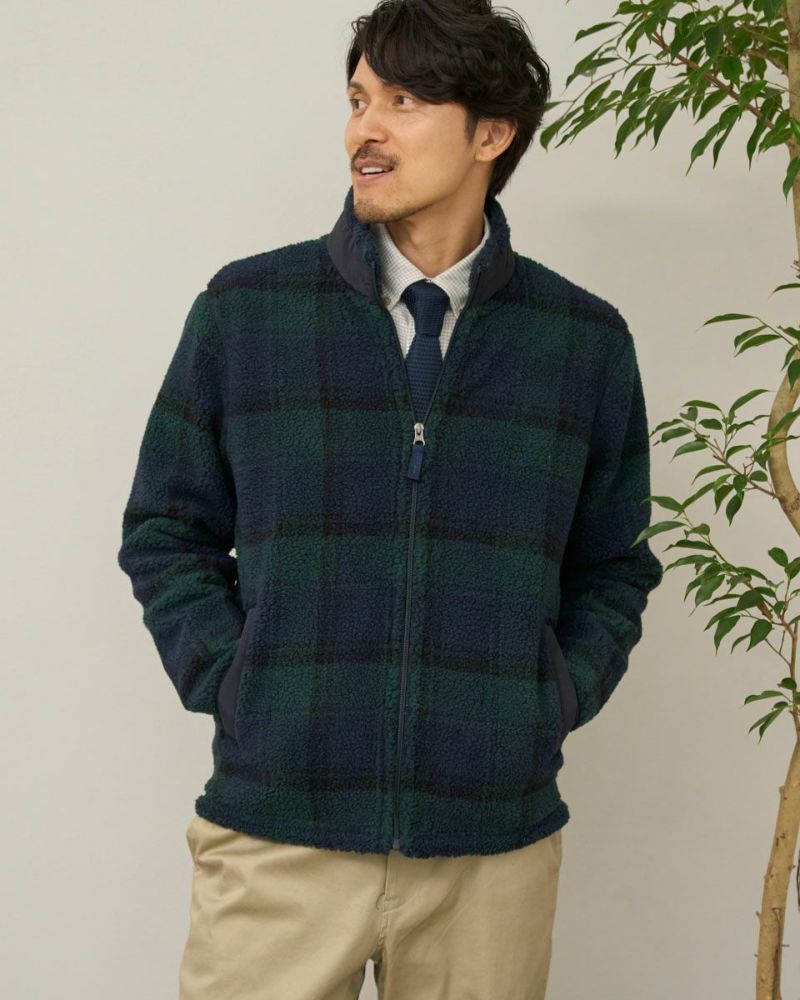 スタンドカラーのZIPブルゾンです。暖かみのあるシープボア素材を使用しています。大柄のチェックをプリントしトラッドな印象に仕上げました。アウターとして軽く羽織れる気軽さが魅力です。 モデル身長: 180 cm 着用サイズ: L サイズ Golden Bear MEN カットソー (MEN) 【着用アイテム】314QE672 モックネックニット 314QD611 クルーネックニット 314QE224 チェックシャツ 314Q3095 ニットタイ