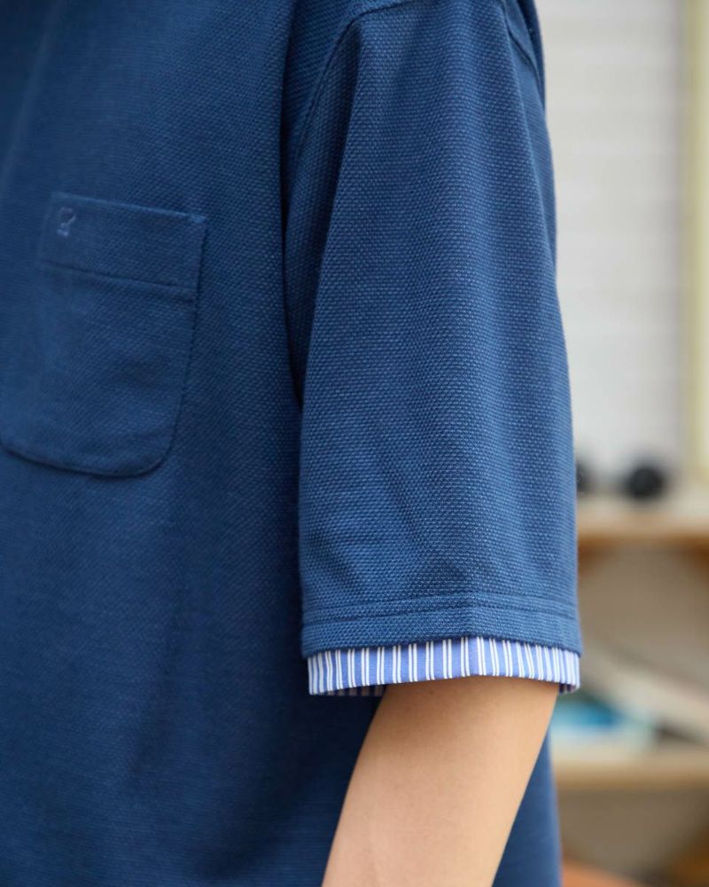表情のあるハニカム鹿の子素材を使用したレイヤードTシャツです。袖口・裾から覗くストライプ地が重ね着しているように演出します。ややゆったりとしたリラックスシルエットです。