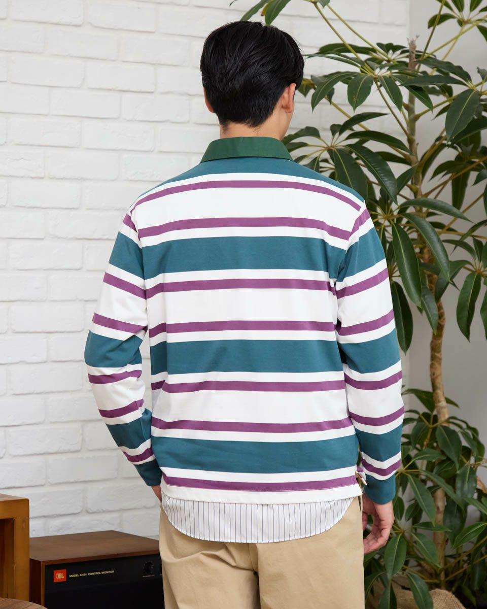 1枚でコーディネートの主役になるラガーシャツです。太ボーダーは視覚的なインパクトが強く、シンプルなボトムと合わせるだけでスタイルが完成します。通常のラガーシャツよりも薄く軽い素材でつくっているので重ね着もしやすいのが特徴です。 モデル身長: 176 cm 着用サイズ: L サイズ Golden Bear MEN カットソー (MEN) 【着用アイテム】314R8102 ドライビングジャケット 314R8403 ラペルカーディガン 314RC204 ストライプシャツ 314RC230 オックスシャツ 314R8701 チノパン 314RC700 ワイドチノ