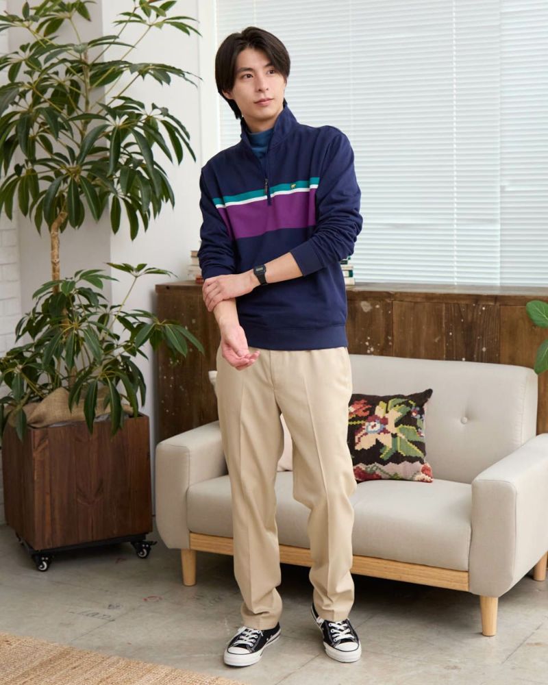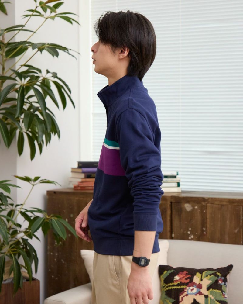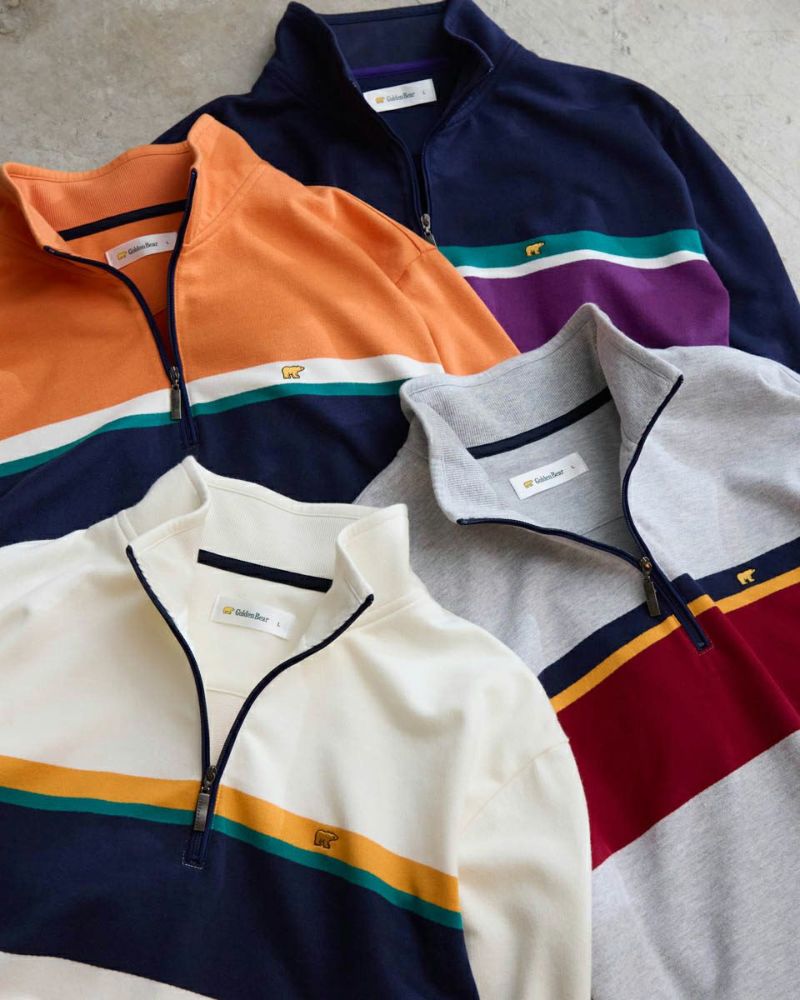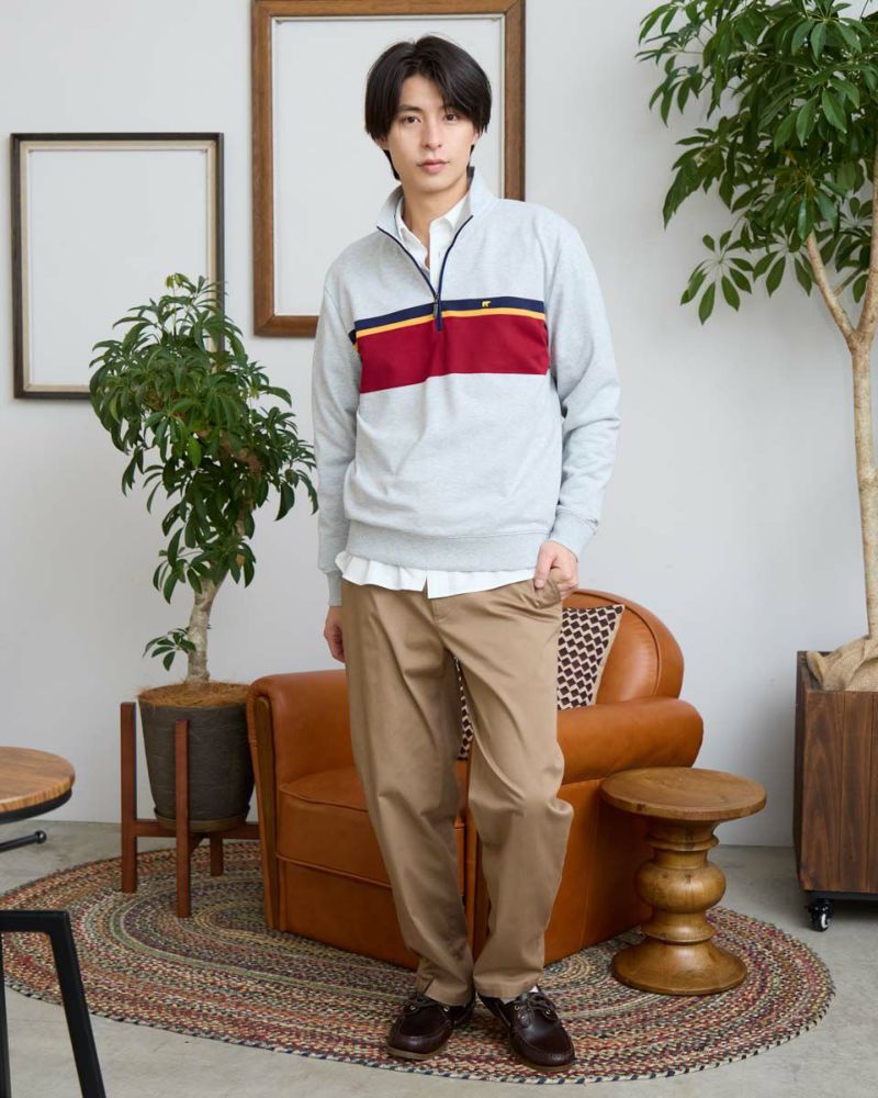 ラガーシャツのようなボーダー配色が特徴のハーフZIPスウェットです。柔らかな風合いに仕上げたインレー組織の生地を使用しています。スラックスやテーパードパンツと合わせることで、スポーティーさを抑え落ち着いた雰囲気を演出します。 モデル身長: 180 cm 着用サイズ: L サイズ Golden Bear Men's カットソー (Men's) 【着用アイテム】314RC230 オックスシャツ 314RD433 ハイネックTシャツ 314RC700 ワイドチノ 314RC704 イージーパンツ
