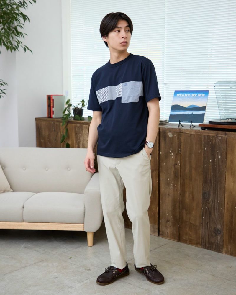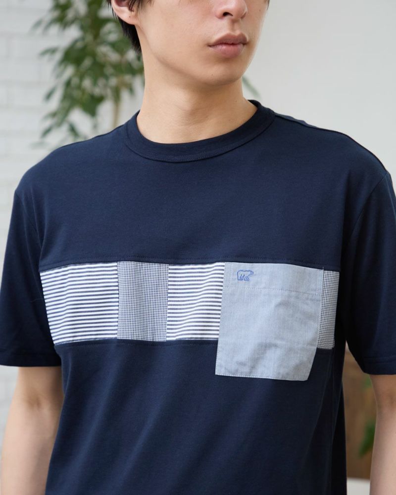 異なる布帛で切り替えたクルーネックTシャツです。胸部分を3種類(ストライプ、チェック、無地)の布帛で切り替えました。大胆な切り替えがコーディネートの主役になるTシャツです。 モデル身長: 180 cm 着用サイズ: L サイズ 同デザイン通常サイズはこちら Golden Bear KING SIZE(Men's 大きいサイズ) カットソー (Men's)