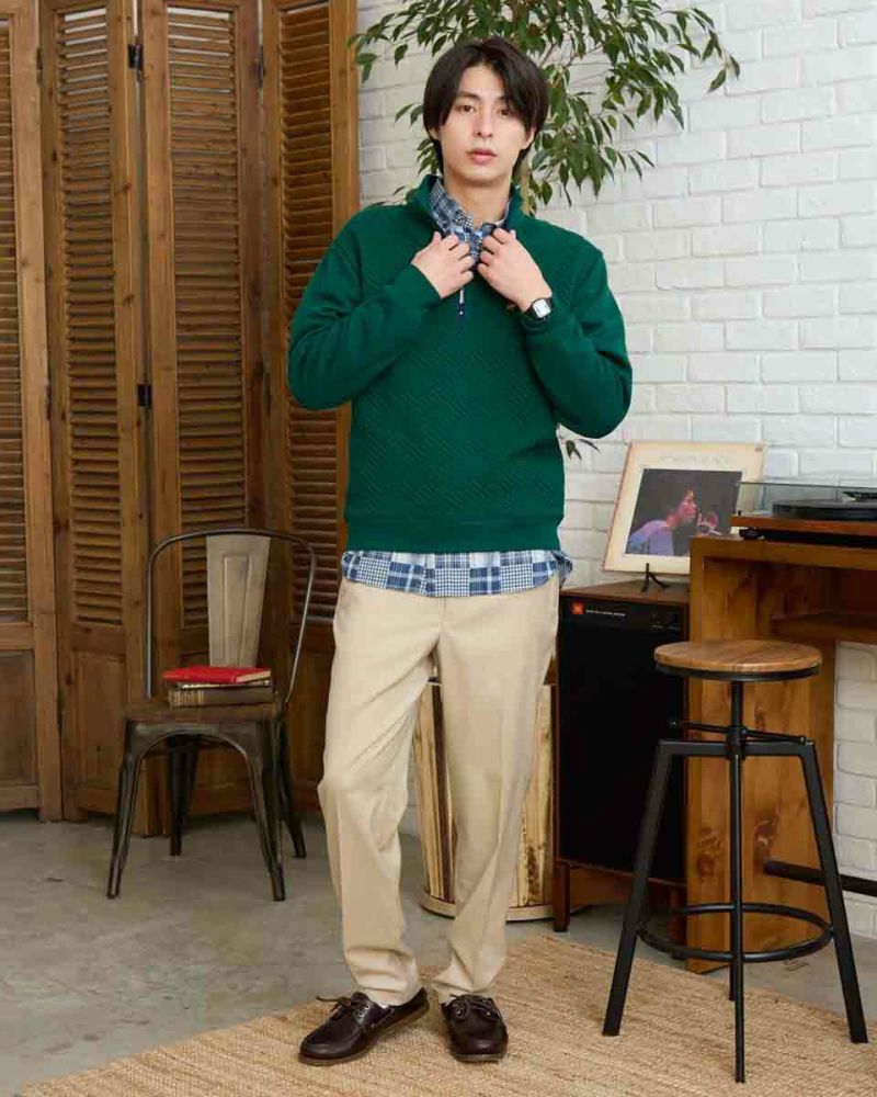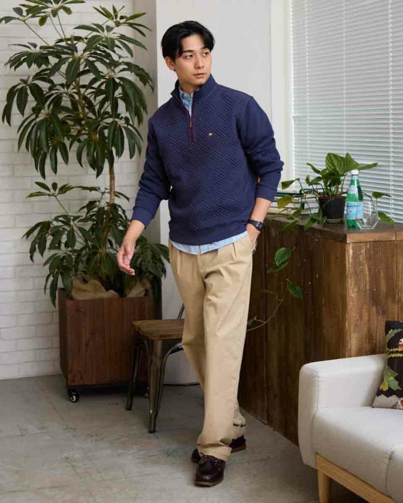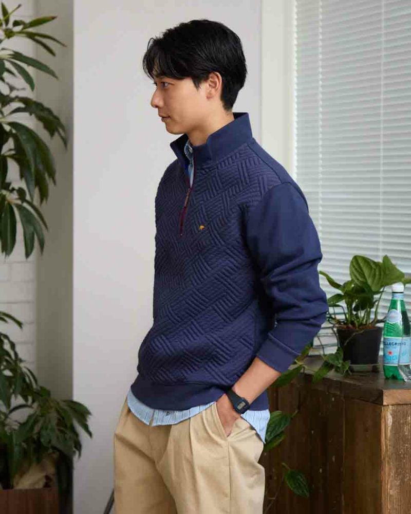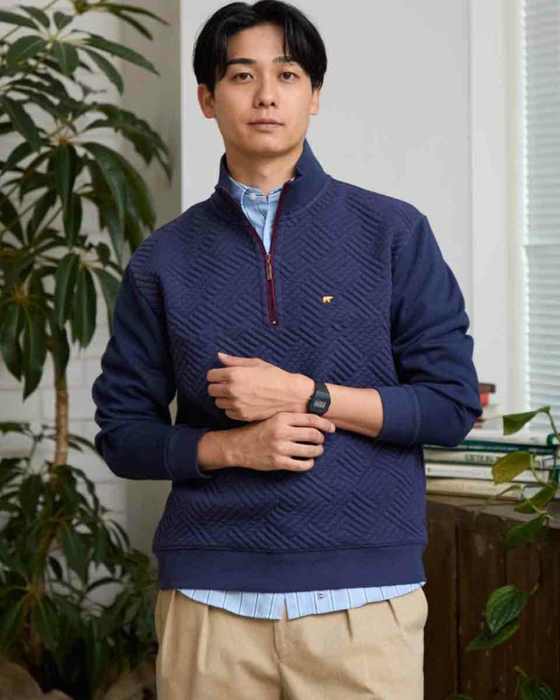 ハーフZIP仕様のスウェットです。前身頃はフクレジャカードで幾何学柄を立体的に表現しました。後身頃、袖はダンボールニット生地を使用しています。様々なコーディネートに着合わせしやすいスウェットです。 モデル身長: 180 cm 着用サイズ: L サイズ 同デザイン通常サイズはこちら Golden Bear KING SIZE(Men's 大きいサイズ) カットソー (Men's) 【着用アイテム】314RC204 ストライプシャツ 314RC207 パッチワークシャツ 314R8702 デニム 314RC700 ワイドチノ