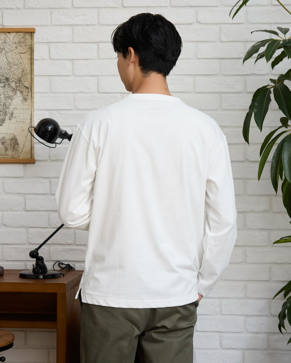 吸水速乾性に優れ、透けにくく、滑らかな肌触りが特長のプレーティング天竺生地を使用した襟がヨレにくい長袖Tシャツです。襟ぐりは身頃同色染で強度のあるフライスを使用 、バインダー始末にすることでヨレにくさを実現しました。ほどよいリラックスシルエットのサイズ感です。 モデル身長: 180 cm 着用サイズ: L サイズ 同デザイン通常サイズはこちら Golden Bear KING SIZE(MEN 大きいサイズ) カットソー (MEN) 家族コーディネートアイテムはこちら 【着用アイテム】314RC704 イージーパンツ