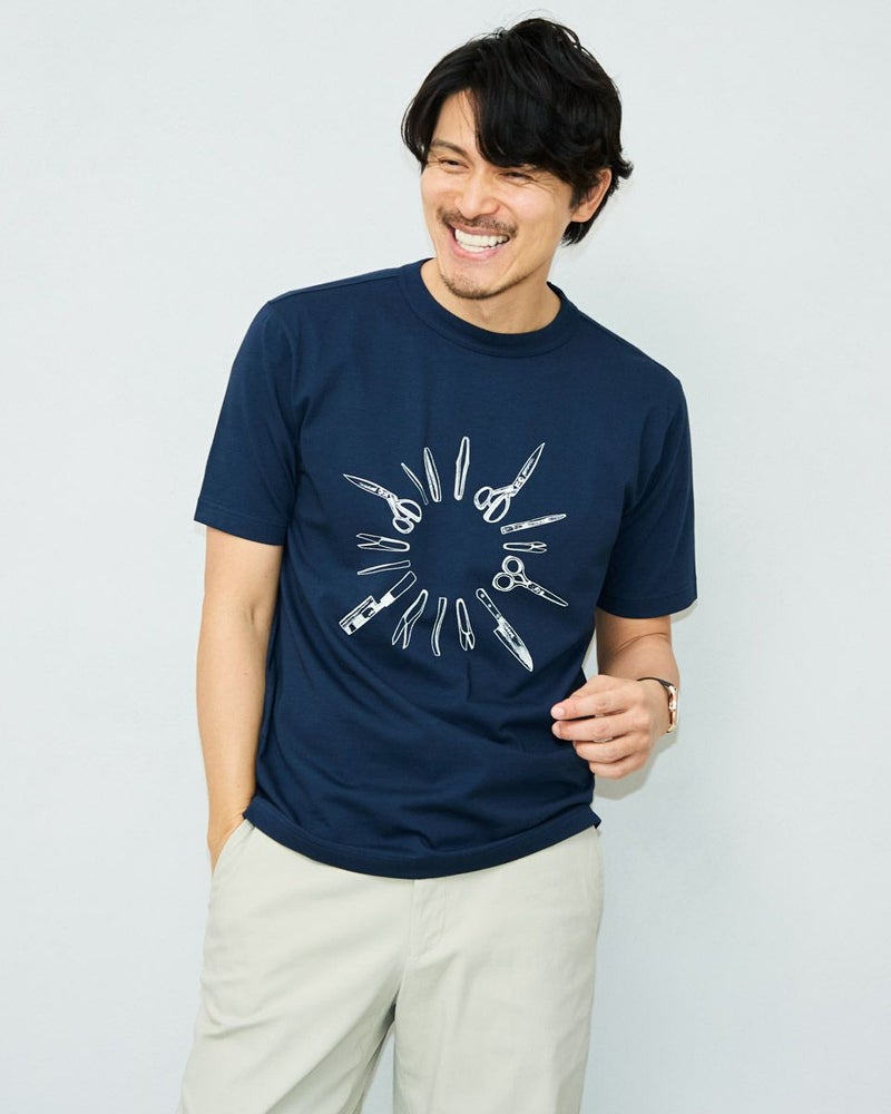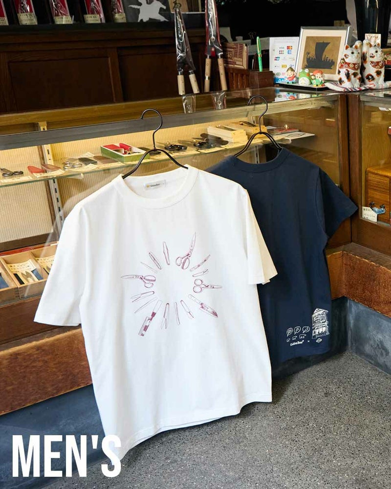 包丁、鋏、毛抜きを製造販売する刃物店のうぶけやさんとコラボレーションしたTシャツです。表には円状に配置したうぶけやさんの人気商品達が勢ぞろい。背中には金熊親子がうぶけやさんにお買い物に行く様子を表現しました。素材は、接触冷感・透け防止・吸水速乾性に優れた滑らかな肌触りのプレーティング天竺。襟ぐりは強度のあるフライスを使用し、バインダー始末にすることでヨレにくくしています。形は程よくゆとりがあり、体にフィットするスタンダードなレギュラーシルエットです。