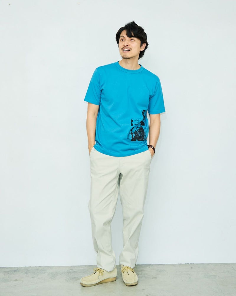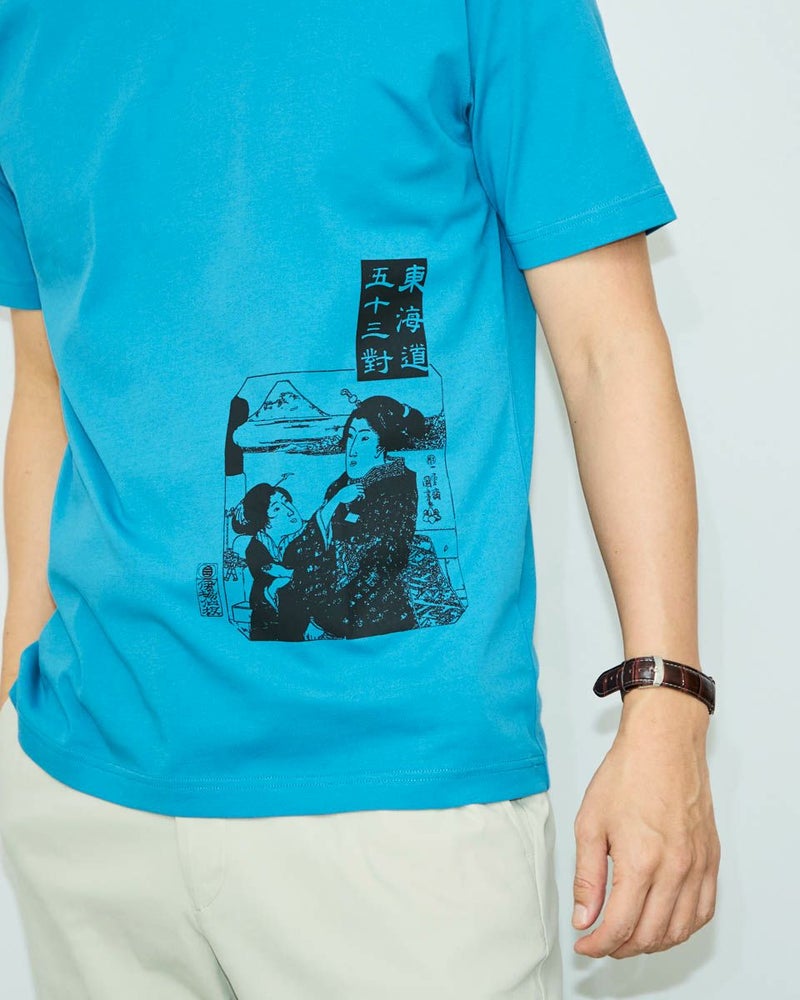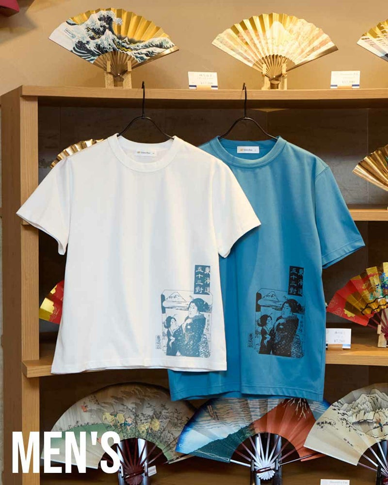 扇子と団扇の老舗である伊場仙さんとコラボレーションしたTシャツです。Tシャツには歌川国芳が描いた東海道五十三對の「日本橋」をプリント。看板とリンクしたカラーにもご注目ください。素材は、接触冷感・透け防止・吸水速乾性に優れた滑らかな肌触りのプレーティング天竺。襟ぐりは強度のあるフライスを使用し、バインダー始末にすることでヨレにくくしています。形は程よくゆとりがあり、体にフィットするスタンダードなレギュラーシルエットです。