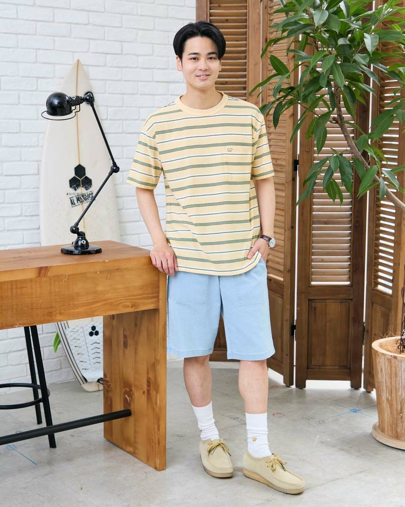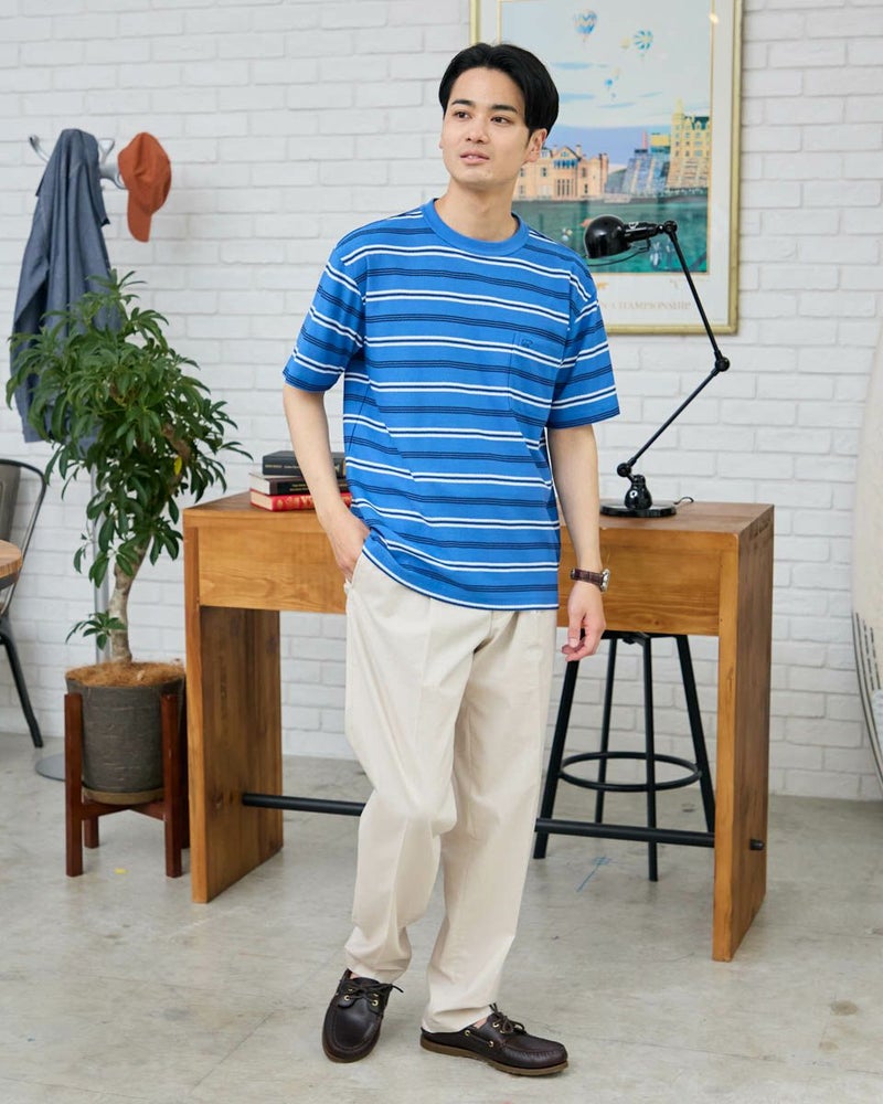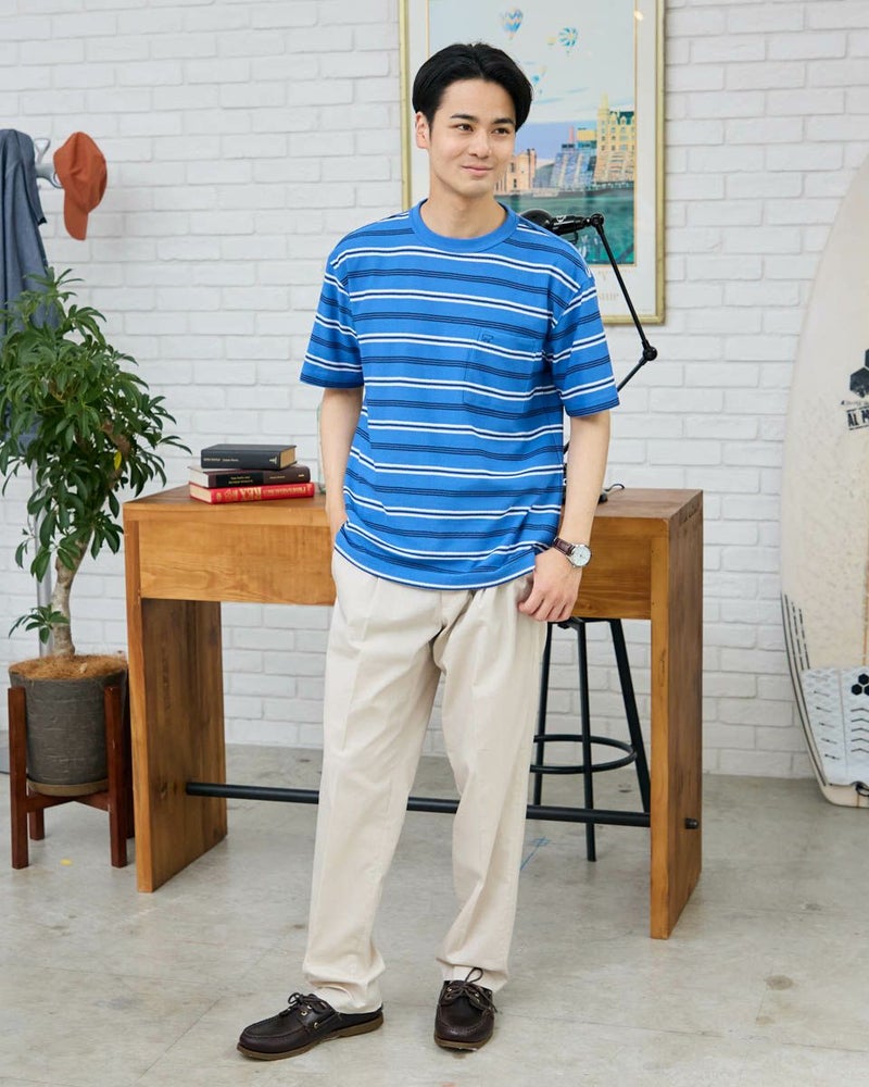マルチボーダーのクルーネックTシャツです。生地の表面に梨の皮のように細かな凹凸がある梨地生地を使用しています。表情があり1枚でも様になるTシャツです。 モデル身長: 176 cm 着用サイズ: L サイズ Golden Bear MEN カットソー (MEN) 【着用アイテム】314R5701 スラックス 314R5710 イージースラックス