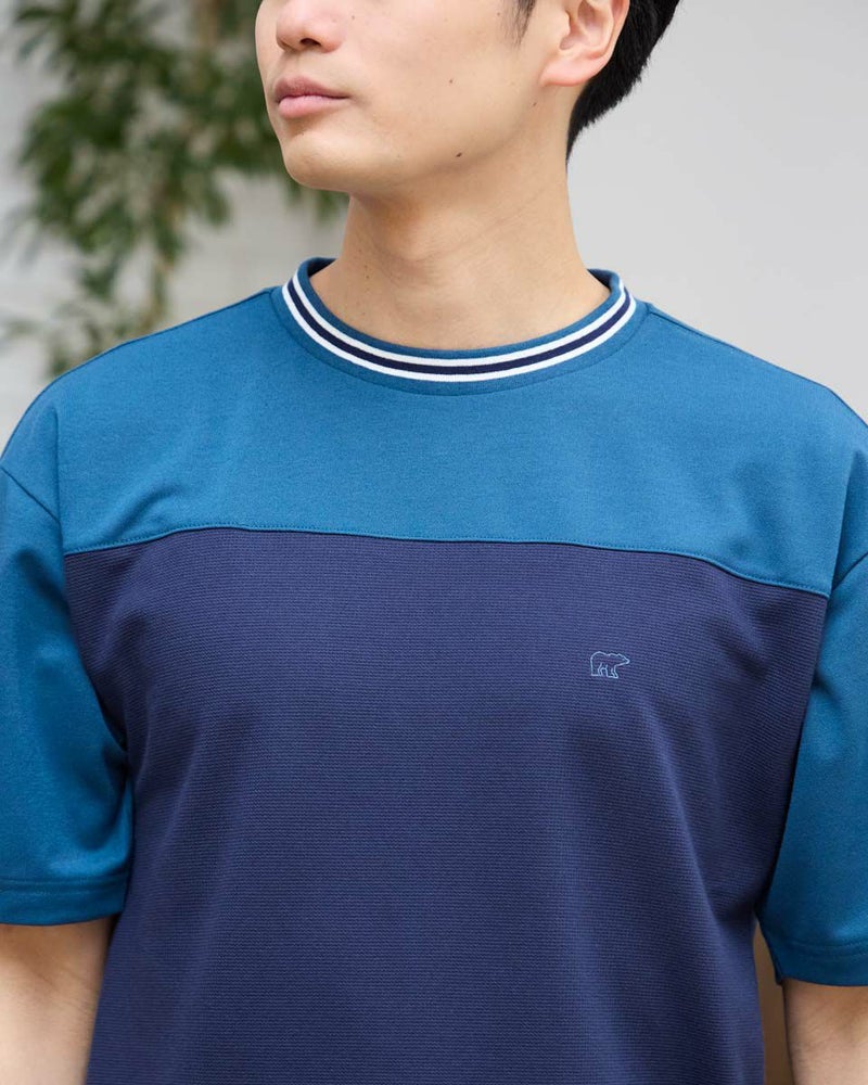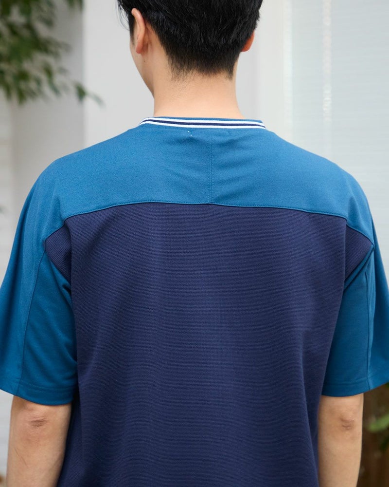 フットボールTをモチーフにしたクルーネックTシャツです。表情のあるボックス鹿の子地とポリエステル鹿の子生地で切り替えました。吸水速乾性に優れており、さらっとした着心地が特徴です。