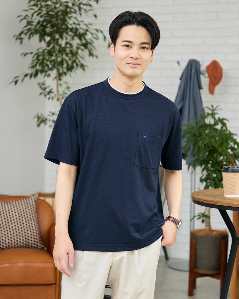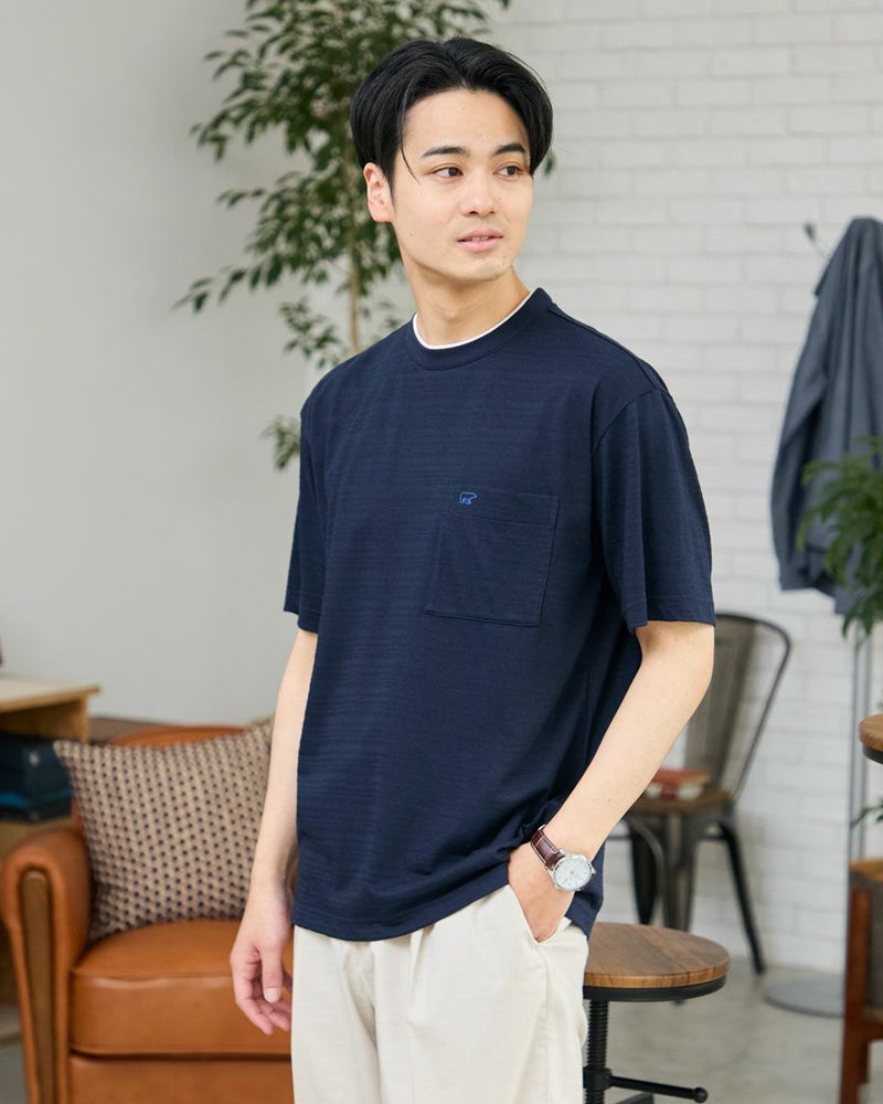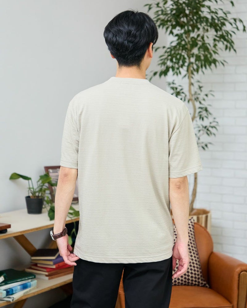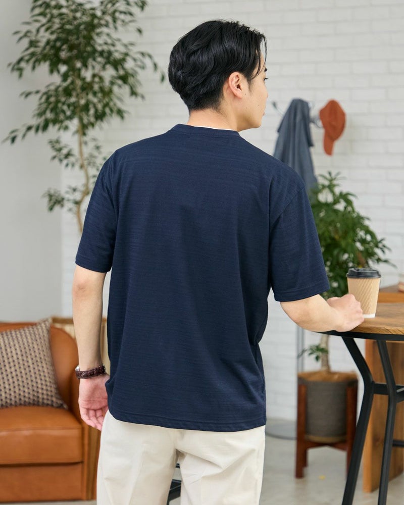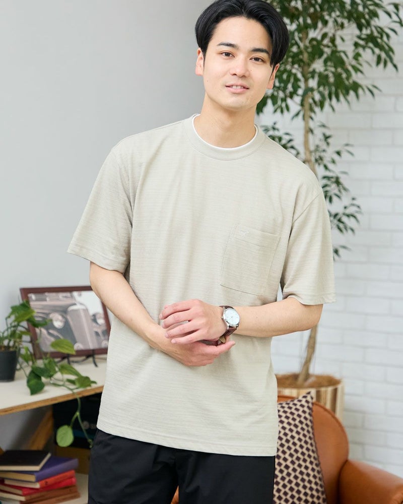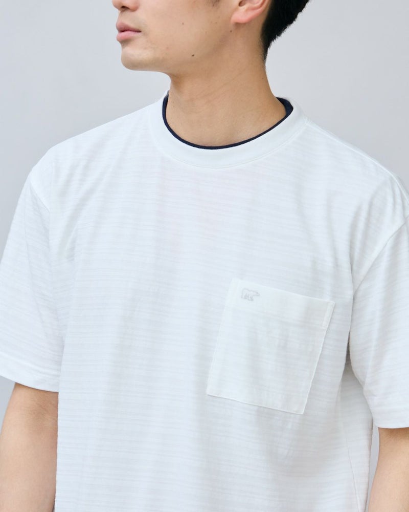 さり気ない同系色ボーダーのクルーネックTシャツです。さらっとした着心地が特徴の鹿の子素材を使用しています。襟のレイヤードがアクセントになり、着回ししやすいTシャツです。