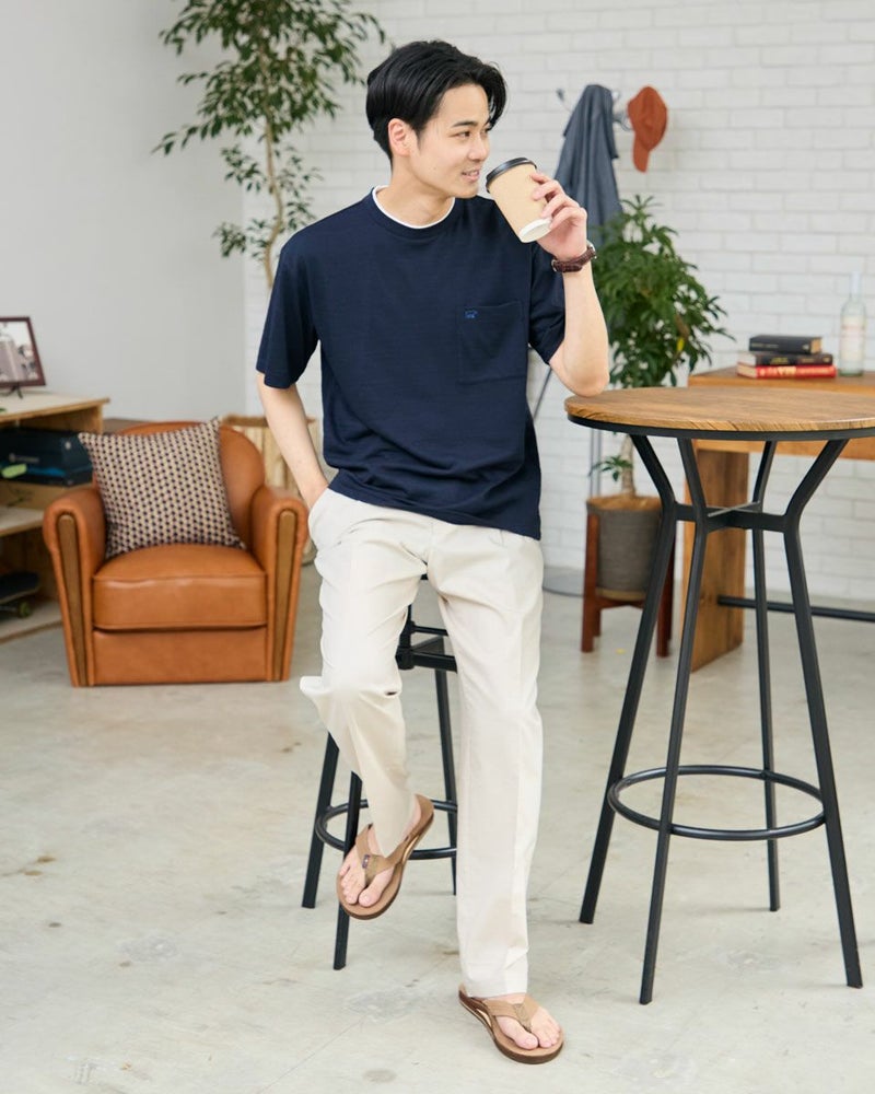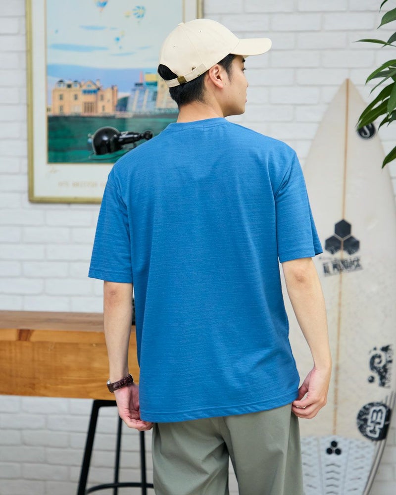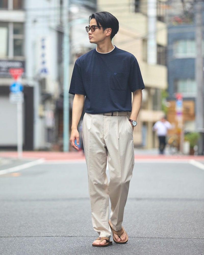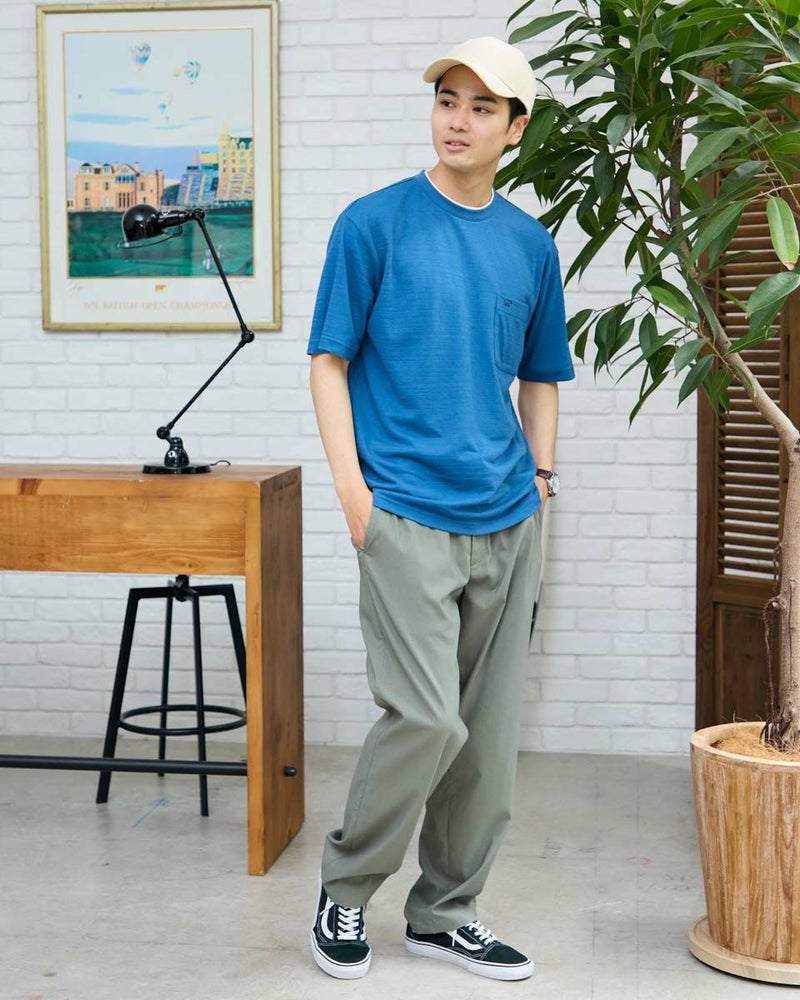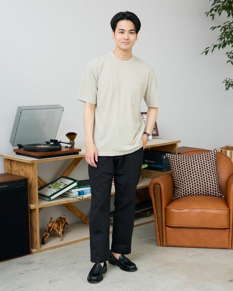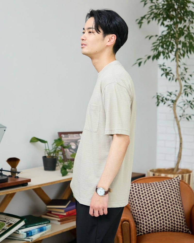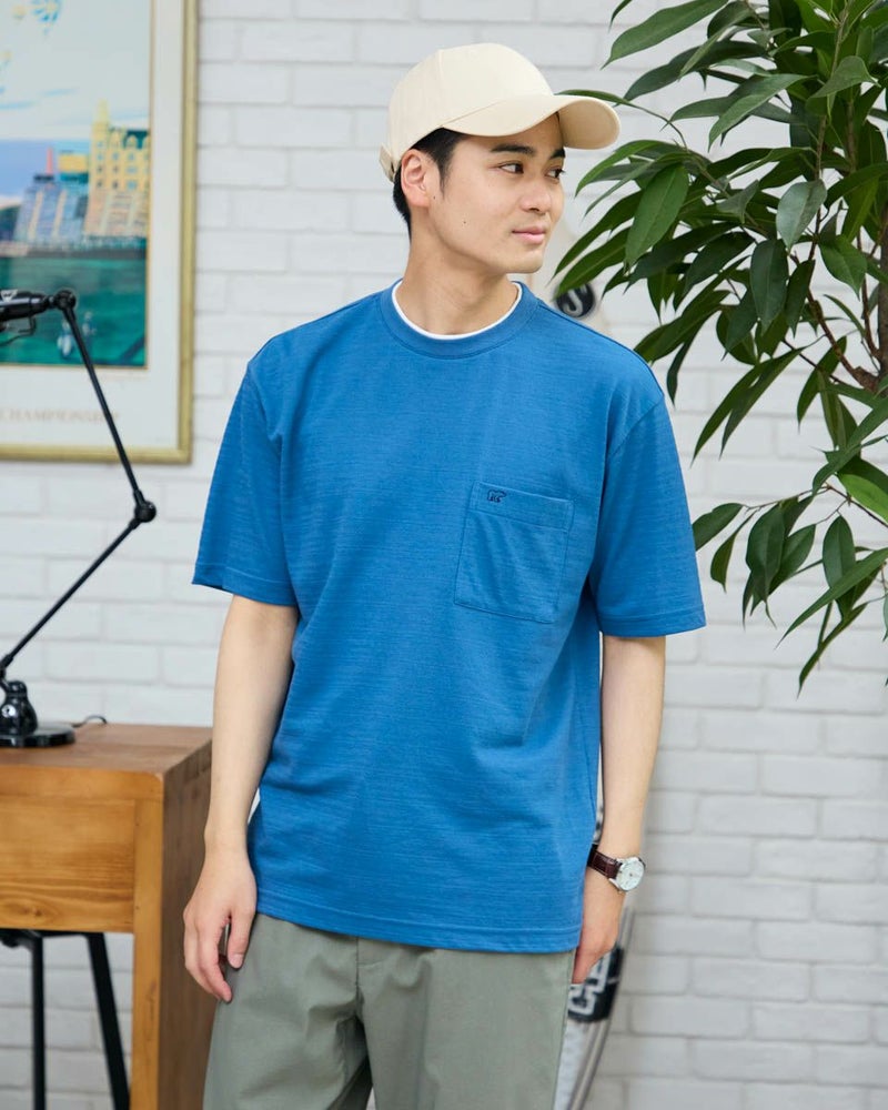 さり気ない同系色ボーダーのクルーネックTシャツです。さらっとした着心地が特徴の鹿の子素材を使用しています。襟のレイヤードがアクセントになり、着回ししやすいTシャツです。