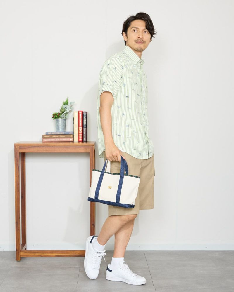 ナチュラルなキャンバス地のボディーに、コントラストカラーのハンドルが印象的なトートバッグです。内側ポケットのGBチェック柄がアクセントになってます。メンズ・レディスの共通企画です。ご夫婦でオススメです。 Golden Bear Ladies' アクセサリ (Ladies') 家族コーディネート 【着用アイテム】467Q4601 カーディガン 467QA401 プリントTシャツ 467QA411 半袖チュニック 467Q6703 テーパードパンツ 467QA703 ストレッチクロプトパンツ