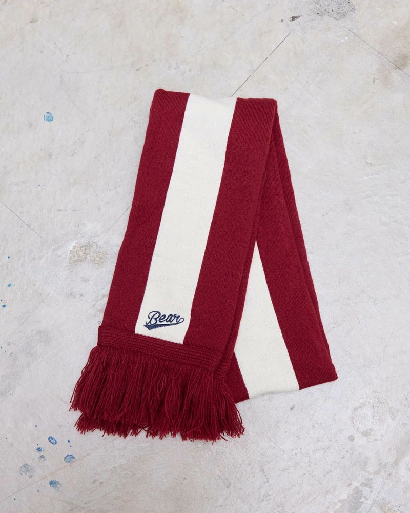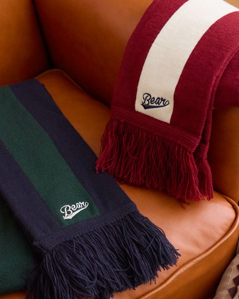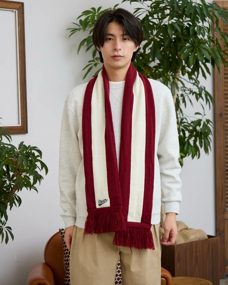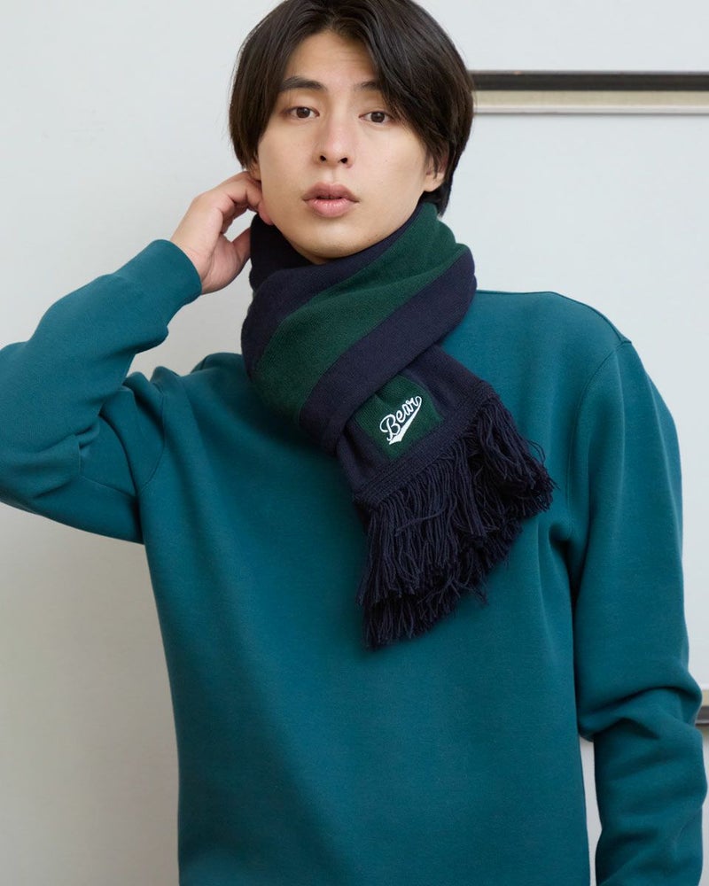 柔らかな肌触りが心地よい、アクリル素材のスクールマフラーです。首に巻いたときにちょうど良いボリューム感で、冬のコーディネートに暖かさとアクセントをプラスします。 筆記体ロゴがさりげなくアクセント。 Golden Bear MEN アクセサリ (MEN) 【着用アイテム】314RC130 デニムカバーオール 314RC204 ストライプシャツ 314RC413 クルーネックスウェット 314RC704 ストレッチイージーパンツ
