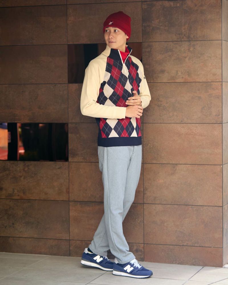 クラシカルなアーガイル柄のハーフZIPニットです。近年ゴルフウェアのニットでは主流となっているポリエステルニット素材を使用しています。なめらかなタッチと、軽さがポイントです。ご家庭で手洗い洗濯が可能で、お手入れラクラク!これ1枚着合わせるだけで、レトロスポーツLOOKが完成! モデル身長: 180 cm 着用サイズ: L サイズ GB GOLF ニット (Men's) 【着用アイテム】 TOURタートルネック (品番: 312QD442 ) GBGパンツ (品番: 312QD705 ) GBGスラックス (品番: 312QC703 )