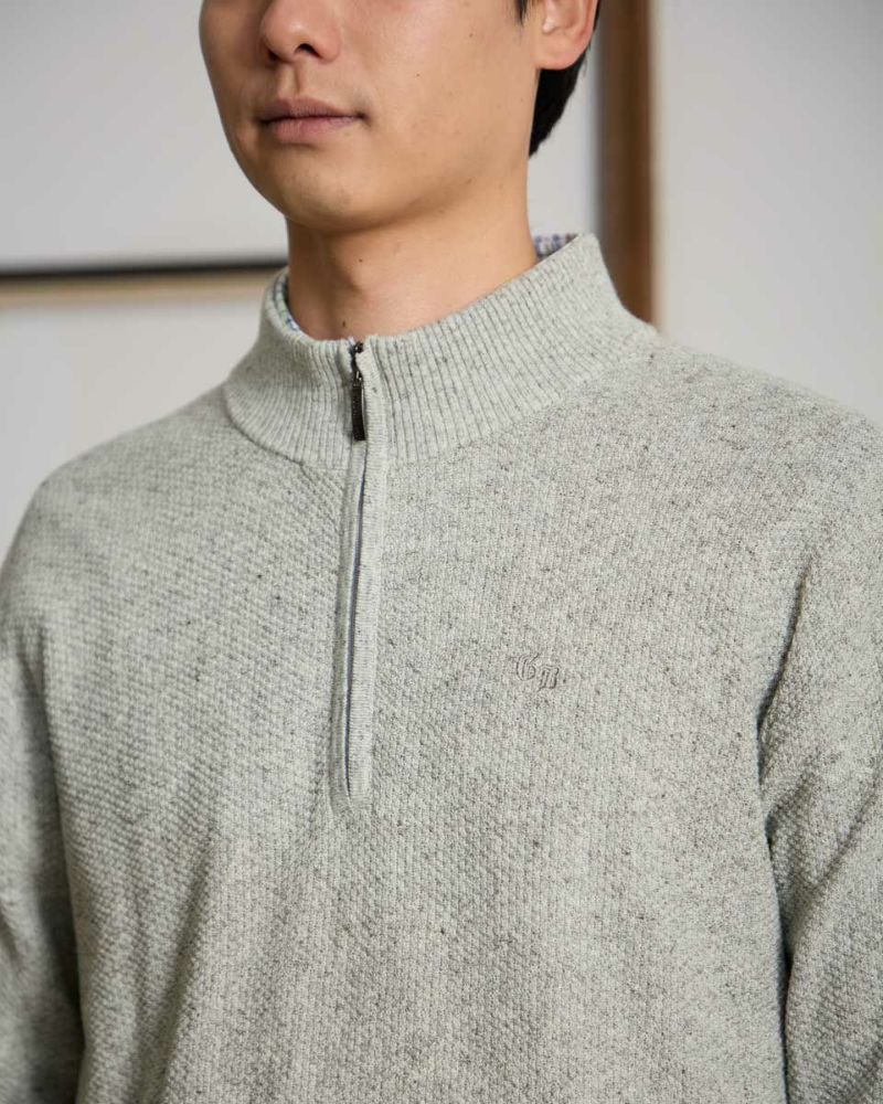 麻混素材のハーフZIPニットです。表情のある鹿の子組織で編みたてました。優しい色合いが特徴です。ポリエステル麻混の素材はさらっとした着心地です。ご家庭でのお洗濯(手洗い)が可能です。春先まで長く着用いただけるニットです。