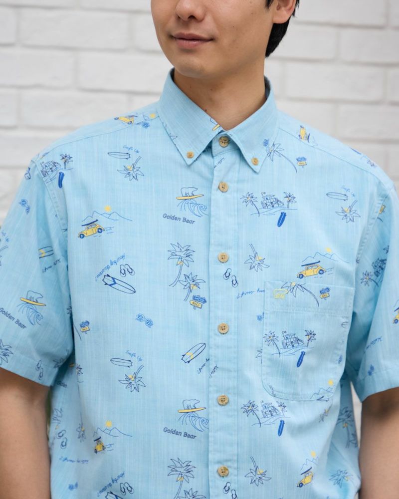 ボタンダウン襟のプリントシャツです。涼感のあるシャンブレー生地にサーフィンをモチーフにした楽しさを感じるプリントを施しました。大きめの胸のダブルポケットと幅広いヨーク切替、太めのステッチなどゆるい雰囲気に仕上げました。サイズ感もややゆったりとしたリラックスシルエットです。 モデル身長: 180 cm 着用サイズ: L サイズ 同デザイン通常サイズはこちら Golden Bear KING SIZE(Men's 大きいサイズ) シャツ (Men's)
