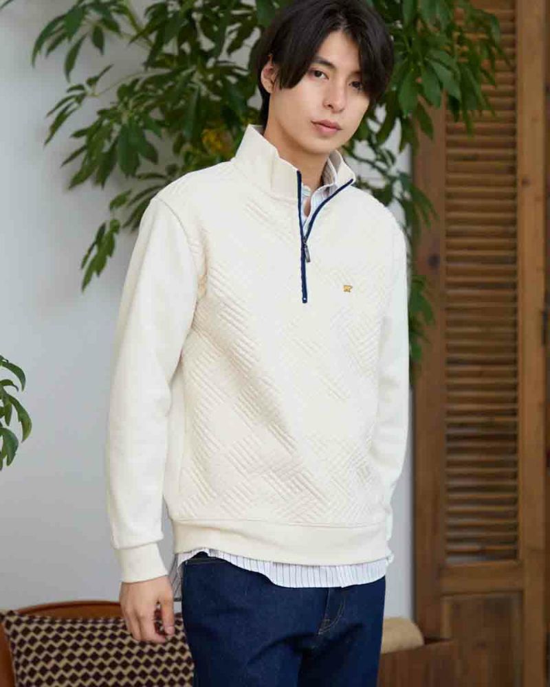 ハーフZIP仕様のスウェットです。前身頃はフクレジャカードで幾何学柄を立体的に表現しました。後身頃、袖はダンボールニット生地を使用しています。様々なコーディネートに着合わせしやすいスウェットです。 モデル身長: 180 cm 着用サイズ: L サイズ 同デザイン通常サイズはこちら Golden Bear KING SIZE(Men's 大きいサイズ) カットソー (Men's) 【着用アイテム】314RC204 ストライプシャツ 314RC207 パッチワークシャツ 314R8702 デニム 314RC700 ワイドチノ