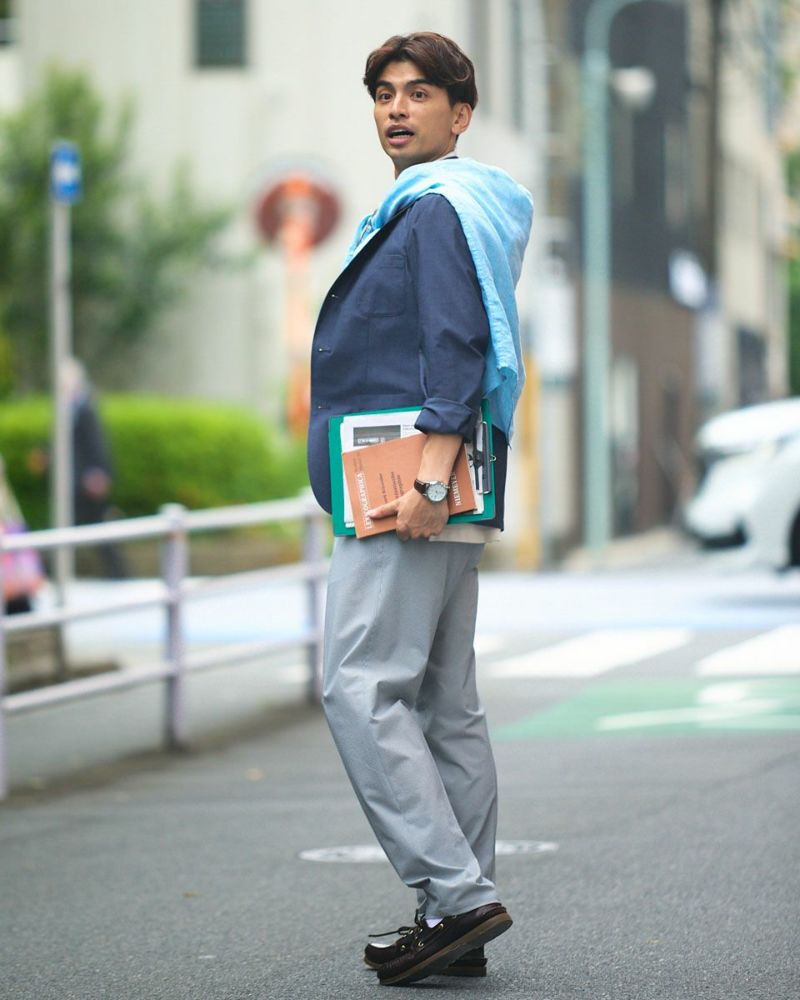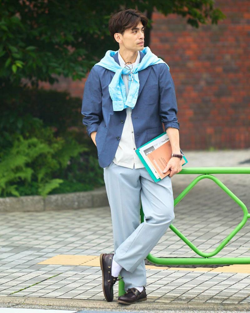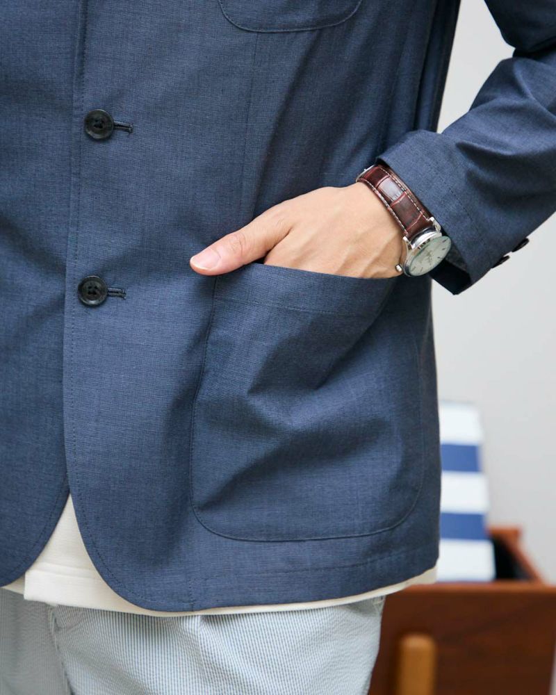 涼感のあるシャンブレー生地を使用したジャケットです。シャツ感覚で羽織れる軽さが特徴です。合わせるインナーによって様々なコーディネートをお楽しみいただけます。ご家庭でのお洗濯(手洗い)が可能で、長い期間ご着用いただけます。