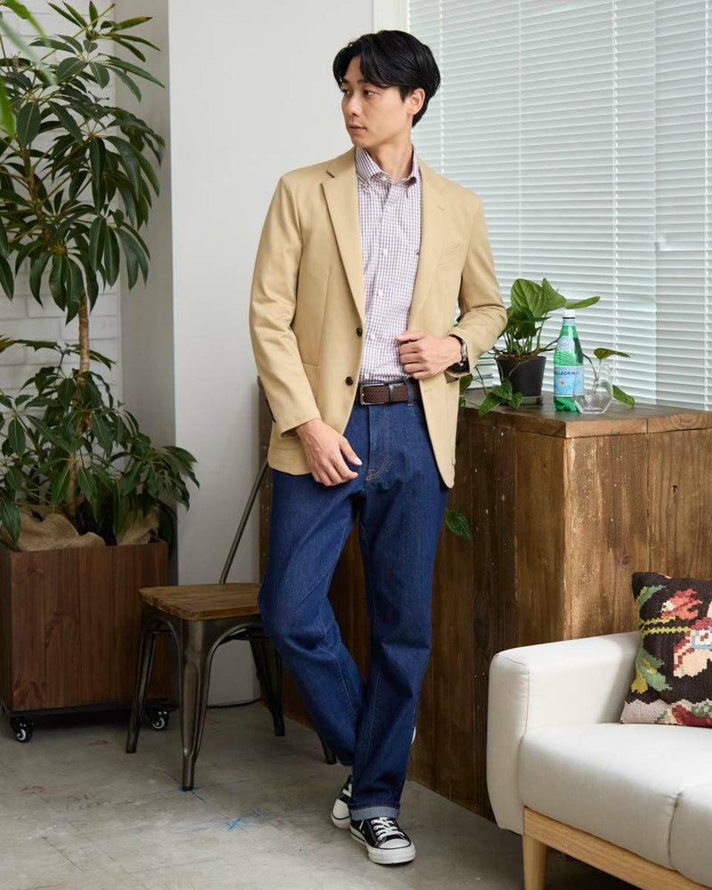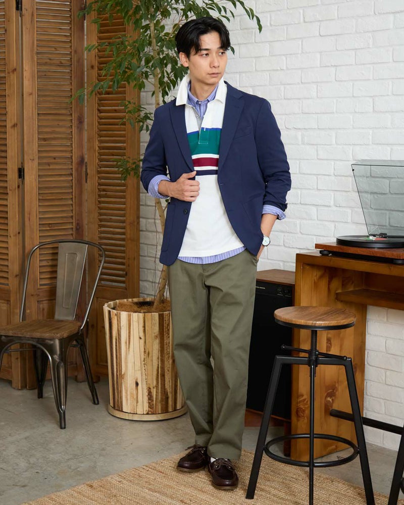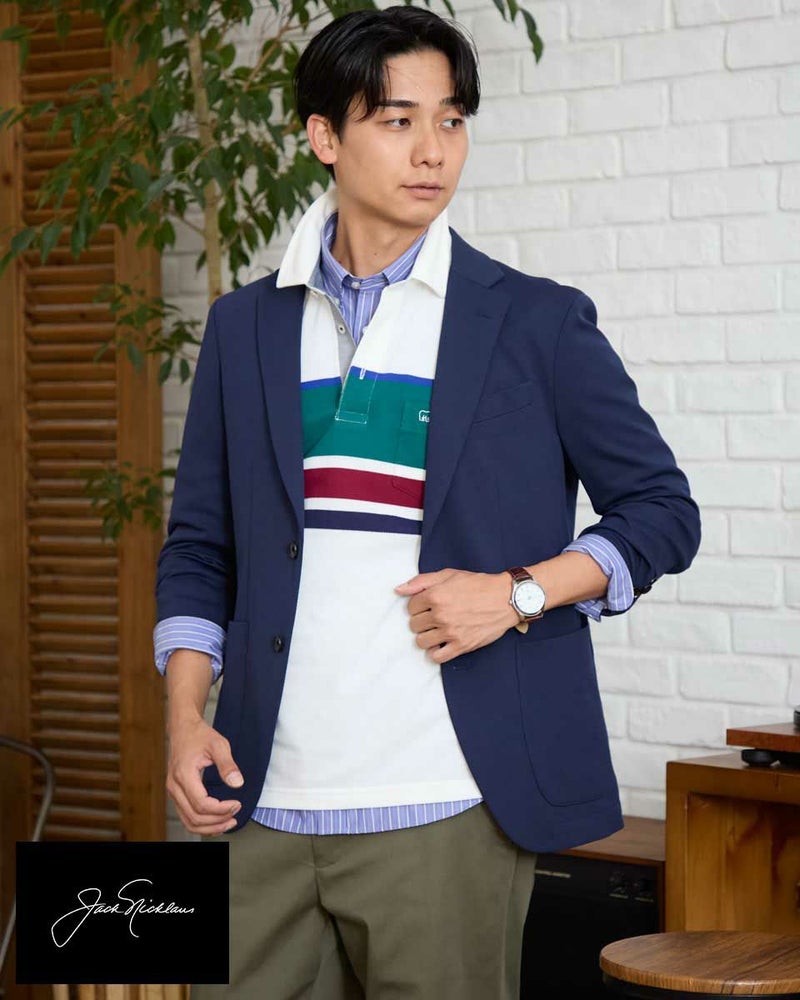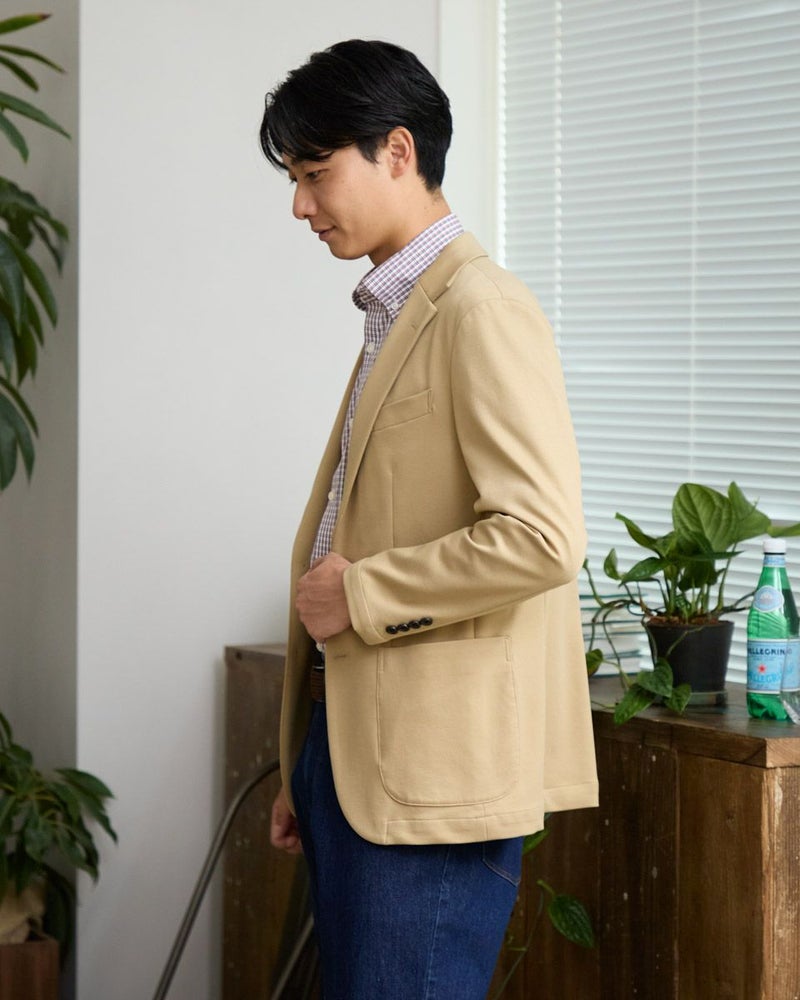 斜めの織り目で表情のあるカルゼジャジー生地を使用したジャケットです。ジャージー素材ならではの伸縮性のよさが魅力です。肩や腕を動かしやすく長時間着ていても疲れにくい快 適な着心地が特徴です。カルゼ特有の光沢と立体感がカジュアルになりすぎず、ビジネスシーンにも対応できるジャケットです。