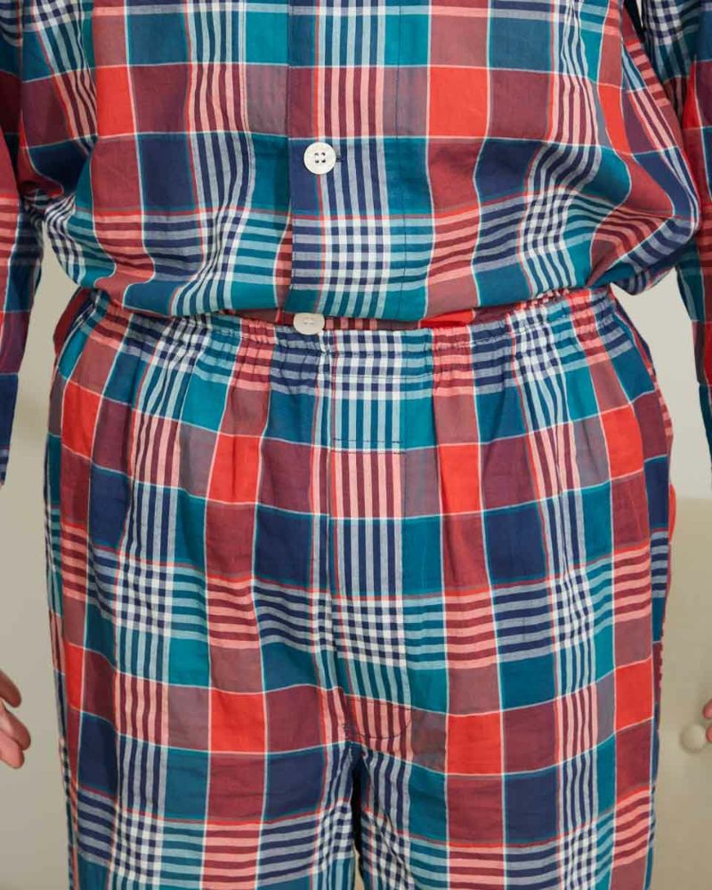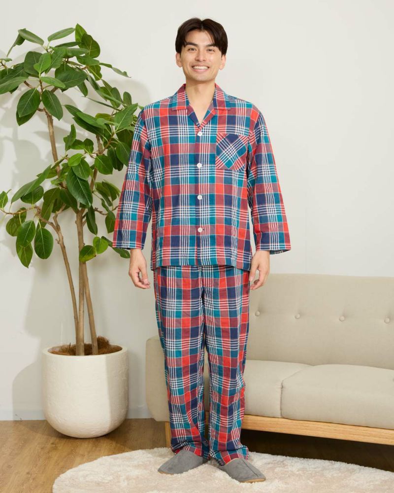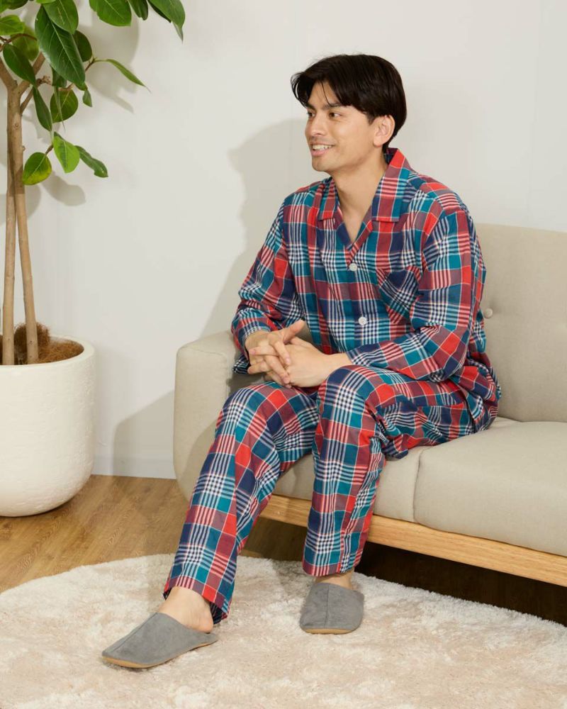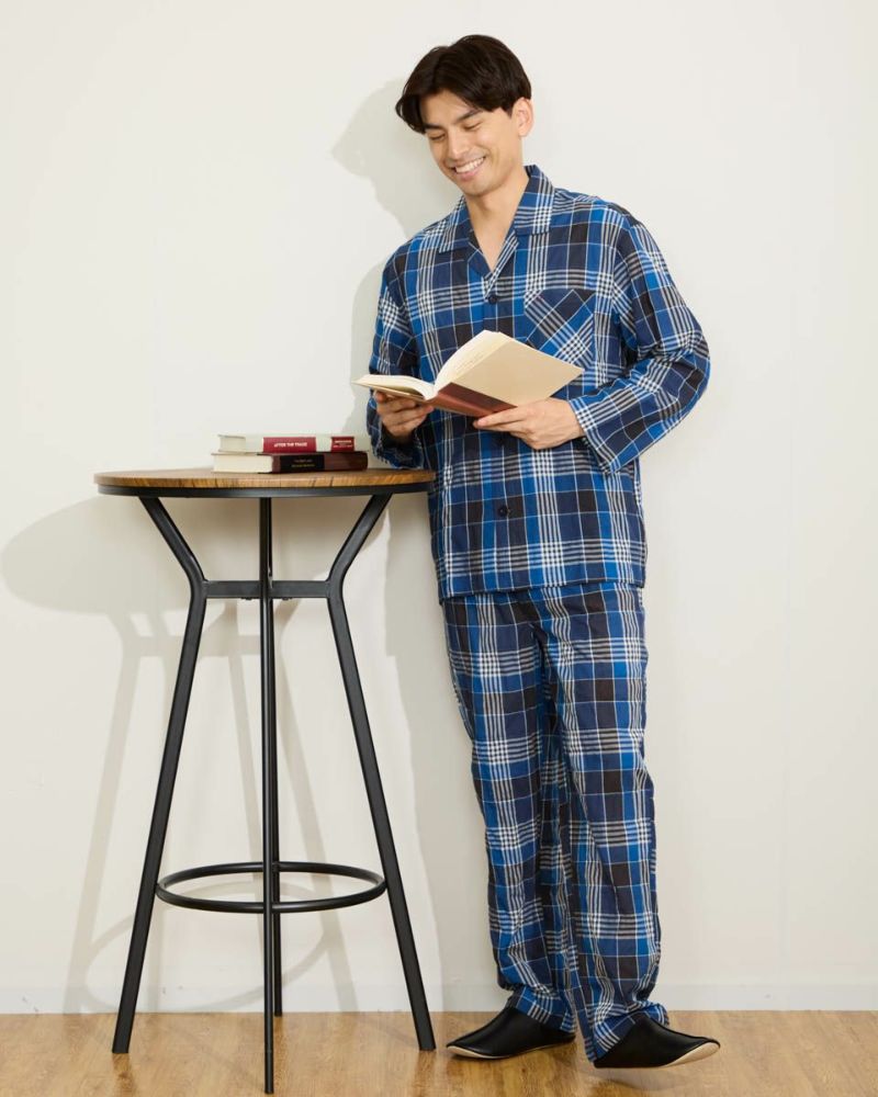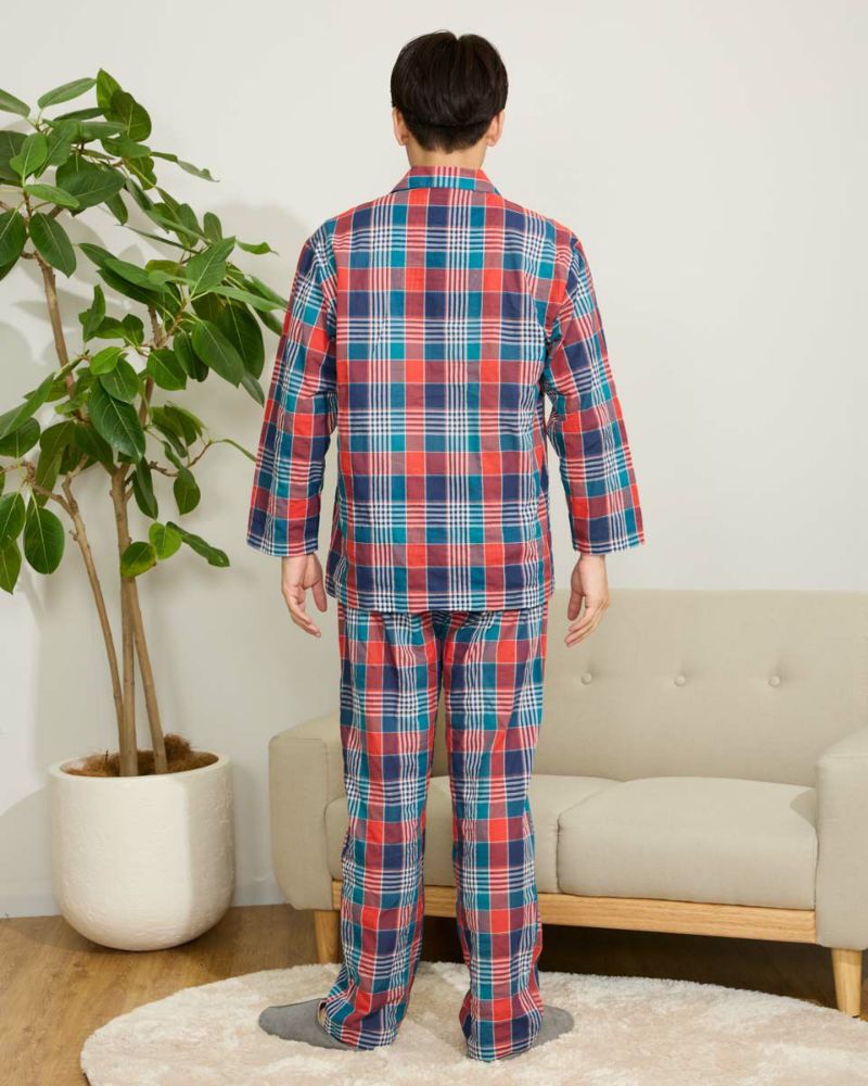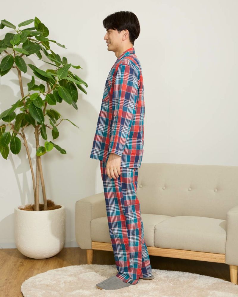 メンズのテーラードパジャマは、ウエストゴムに細いコールゴム2本を採用しているのでソフトなフィット感をお楽しみいただけます。また、ヒップラインにゆとりを持ったパターンでゆったりとした着用感になります。