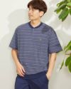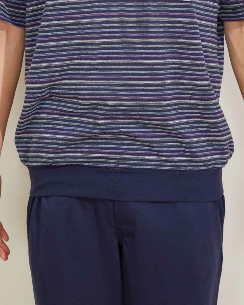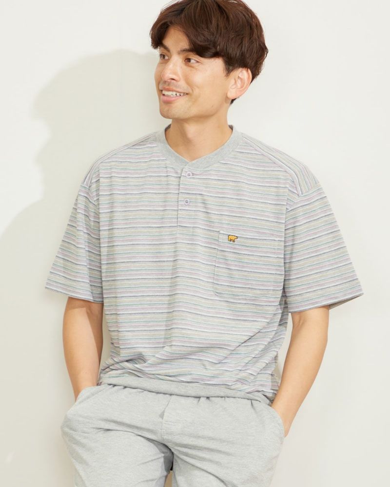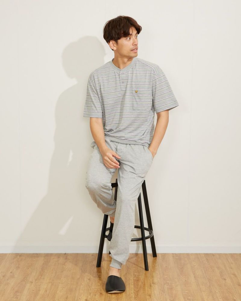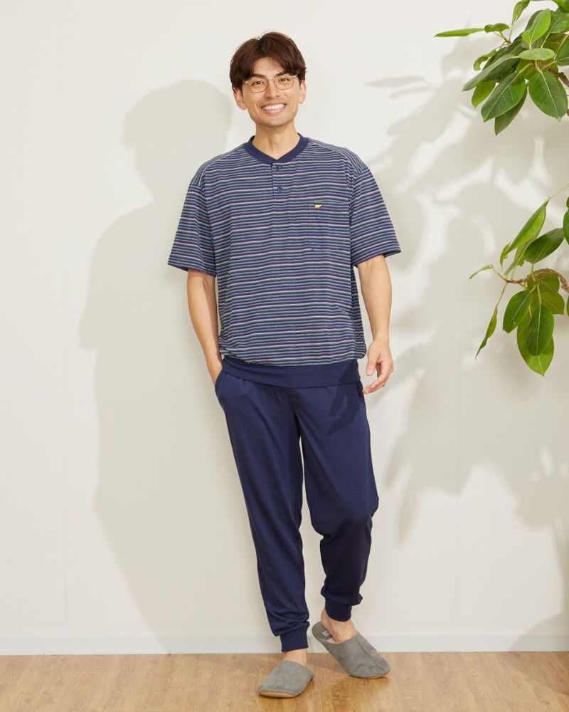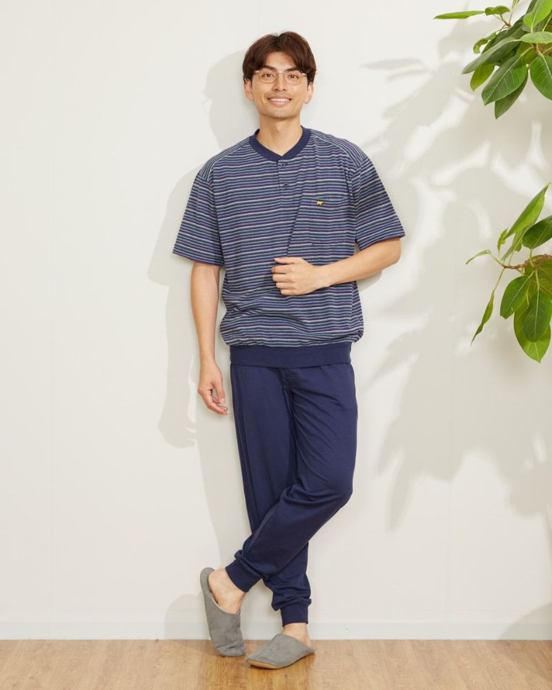 ボーダー柄の半袖ヘンリーネックパジャマです。表面に凹凸があるので肌離れが良く、さらさらとした肌触りの素材を使用しています。