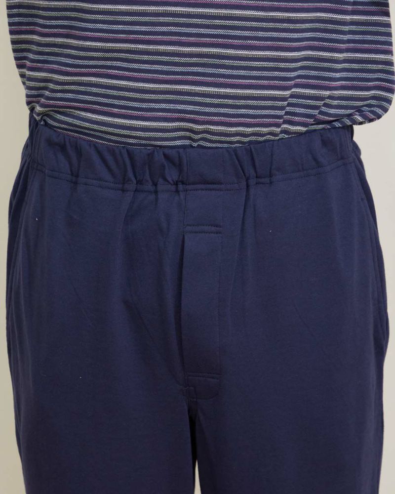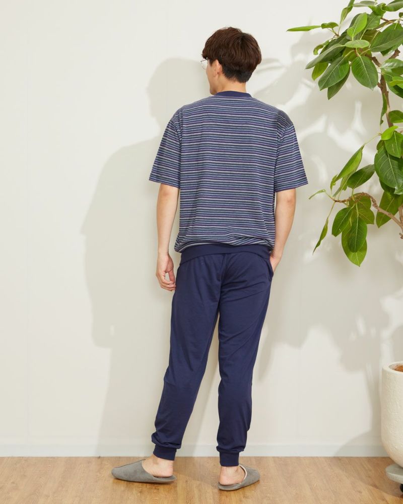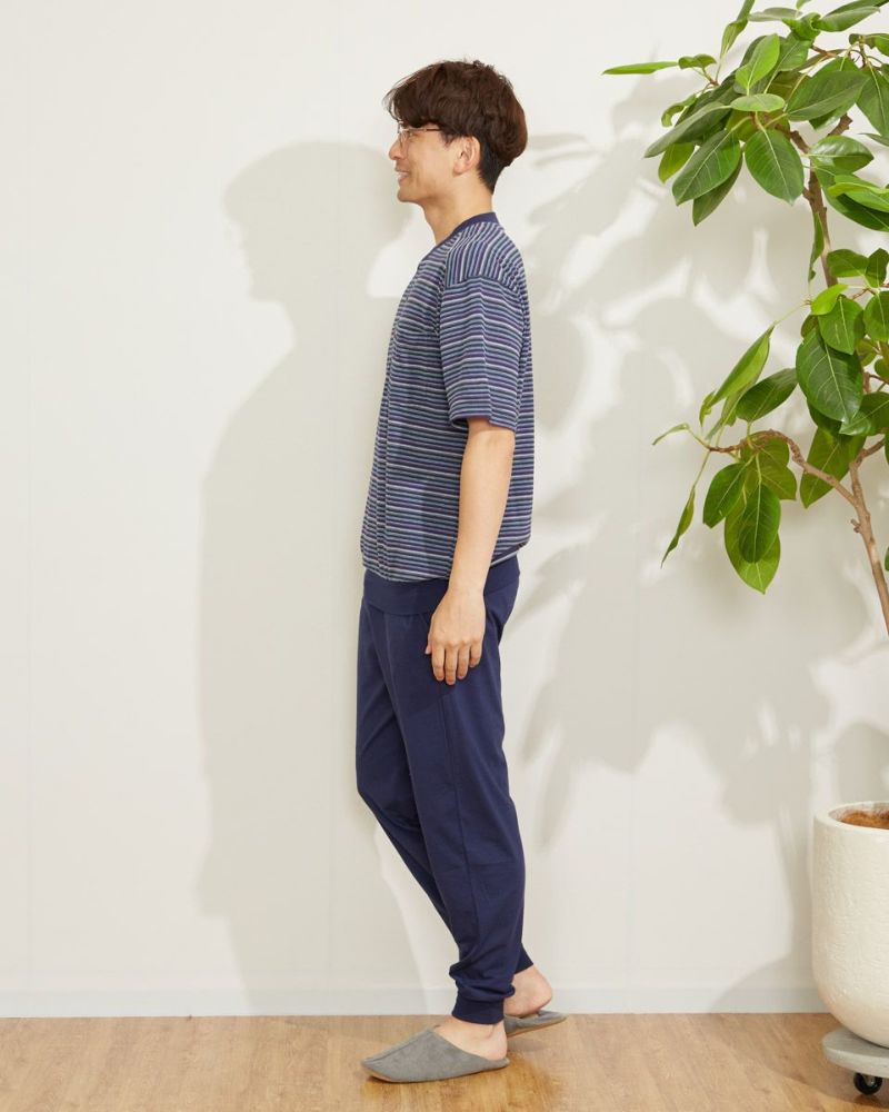メンズのカットソーパジャマは、トップスの手口・裾口、ボトムスの足口にはリブの絞りを入れており、風が入らず快適な着心地をキープします。