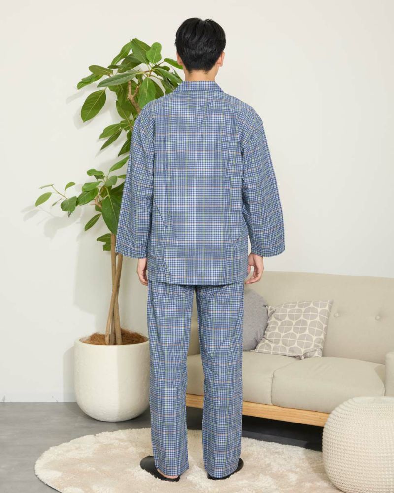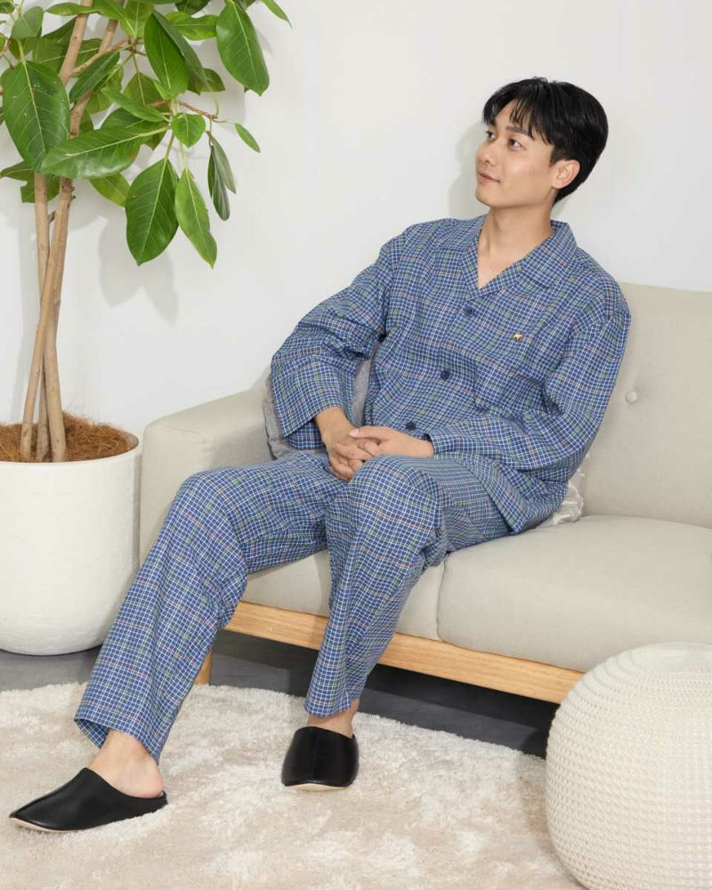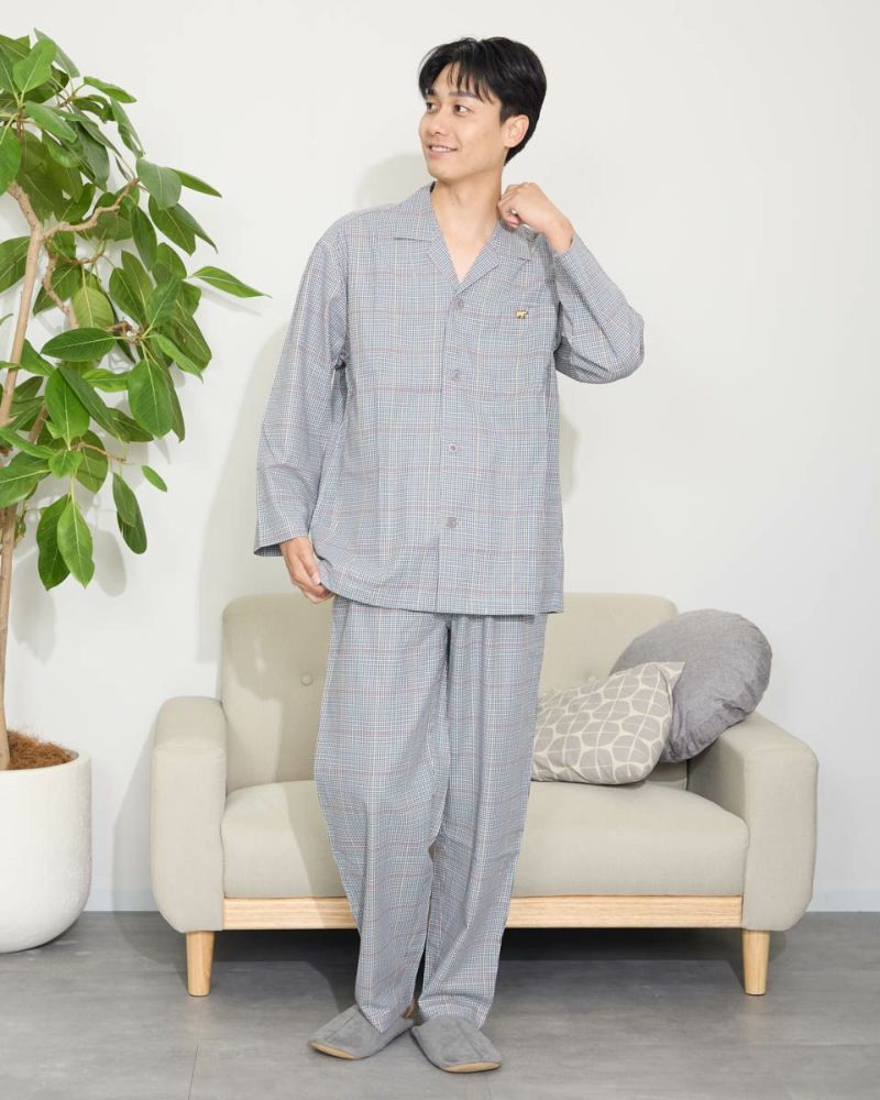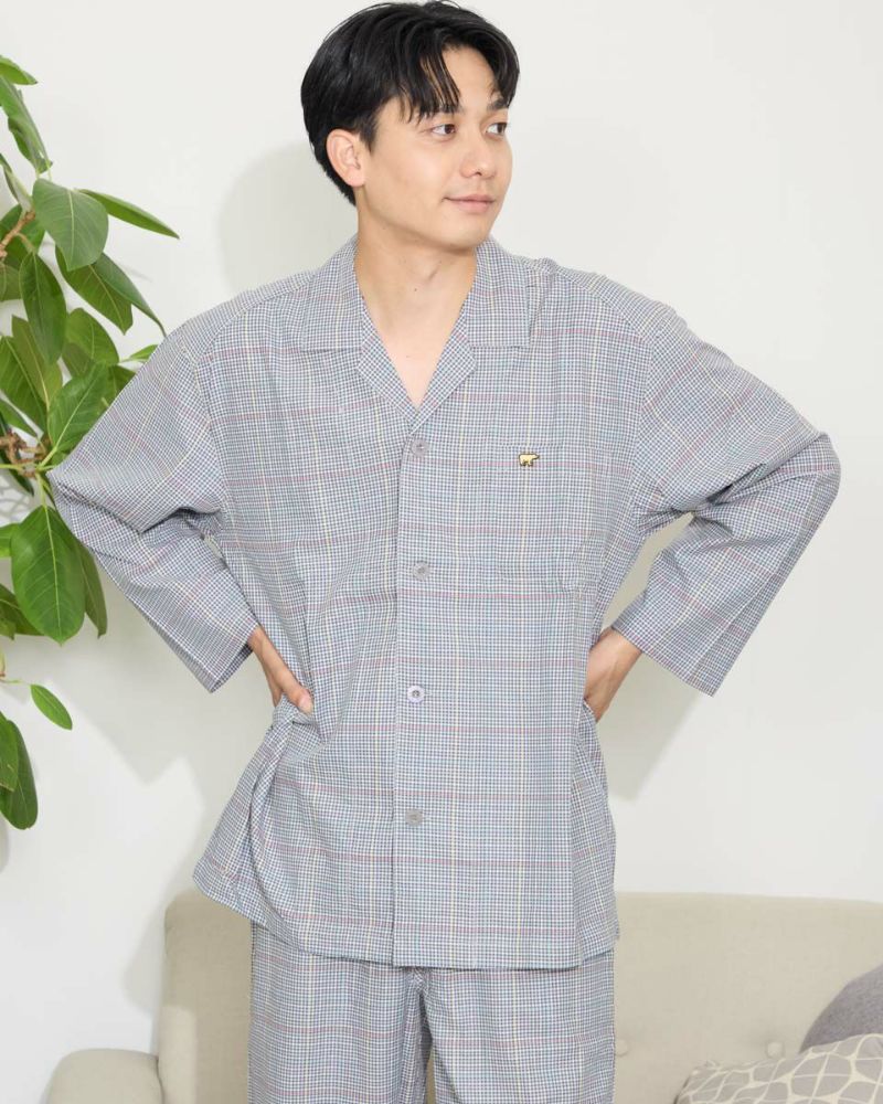 チェック柄の長袖・長ズボンのテーラードパジャマです。柔らかい綿100%のツイル素材を使用しました。ゆったりとしたサイズ感で、着心地の良さがおすすめです。