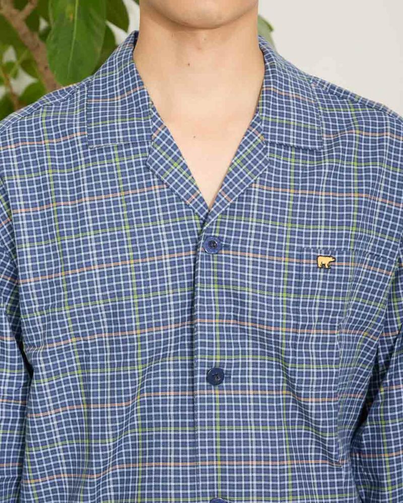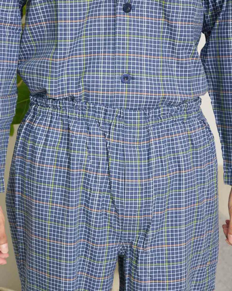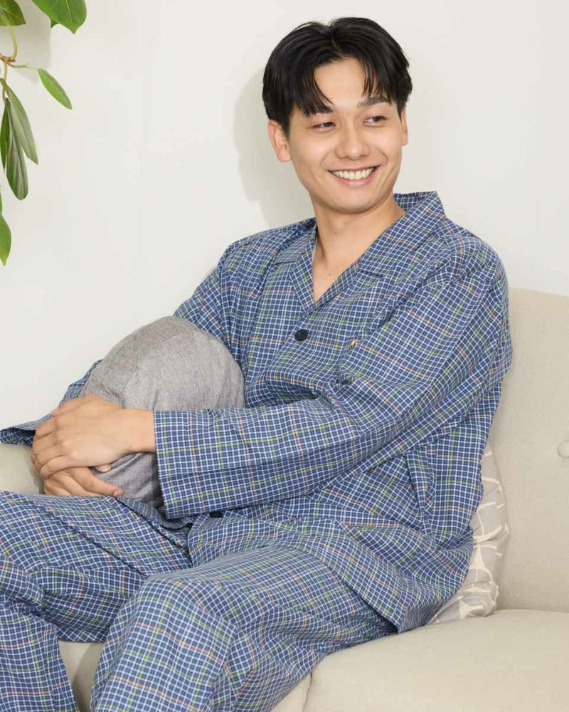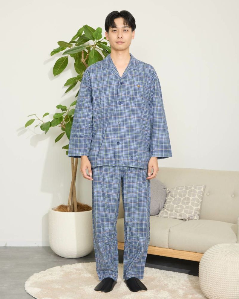 チェック柄の長袖・長ズボンのテーラードパジャマです。柔らかい綿100%のツイル素材を使用しました。ゆったりとしたサイズ感で、着心地の良さがおすすめです。