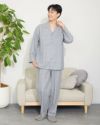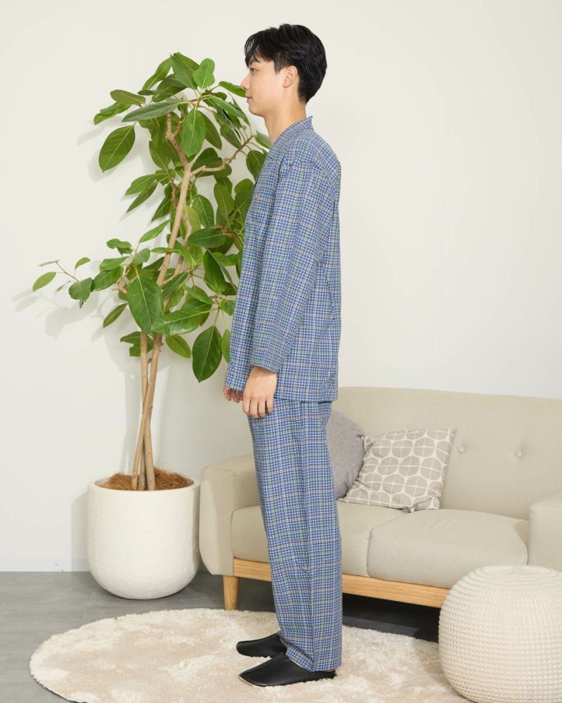 メンズのテーラードパジャマは、ウエストゴムに細いコールゴム2本を採用しているのでソフトなフィット感をお楽しみいただけます。また、ボトムスは前開き仕様で、ヒップラインにゆとりを持ったパターンでゆったりとした着用感になります。