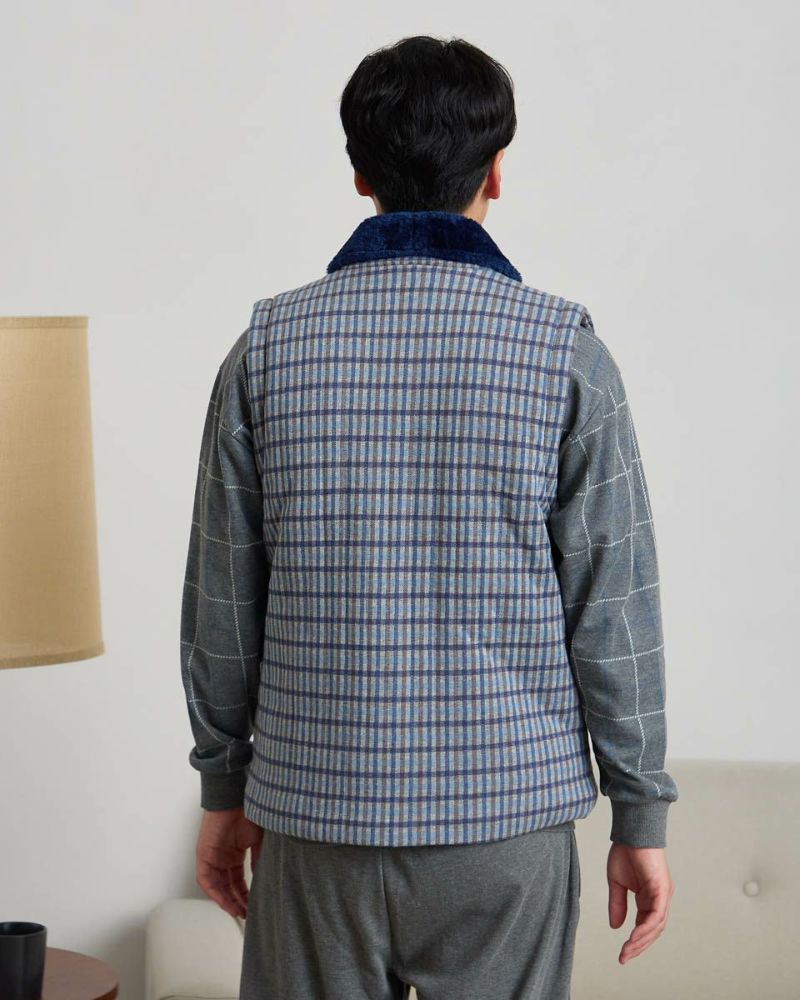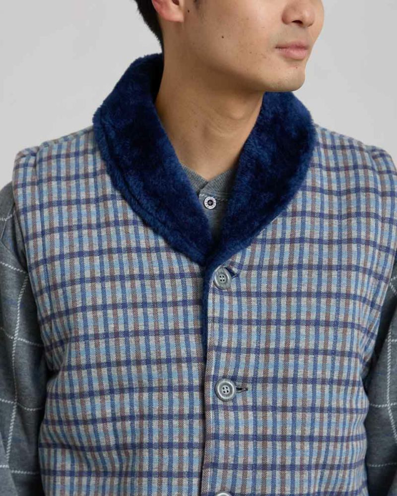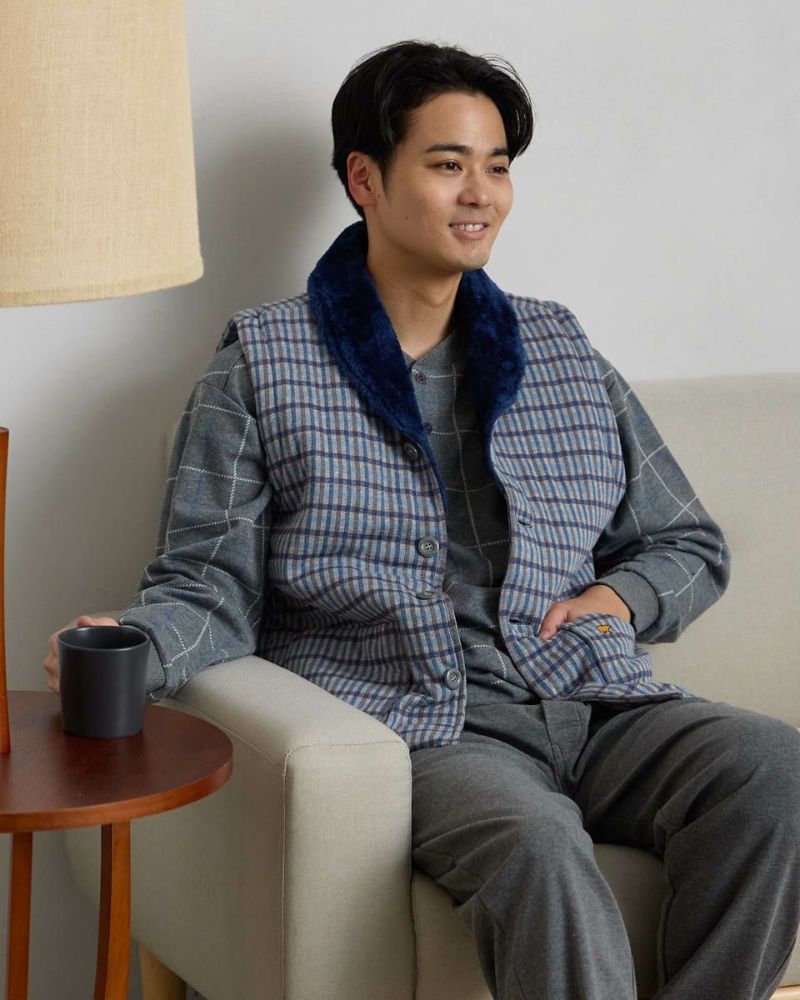チェック柄の中綿入りベストです。柔らかなジャカード素材を使用しました。裏生地は、ボリュームのあるボア素材仕様で、暖かさと着心地の良さがおすすめです。 肌寒い季節に羽織っていただける快適アイテムです。 (品番139QC601と139QC611は同商品です。) モデル身長: 176 cm 着用サイズ: S サイズ Golden Bear Home Wear (Men's パジャマ・肌着類)