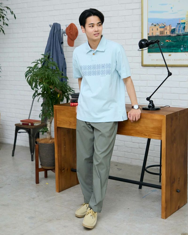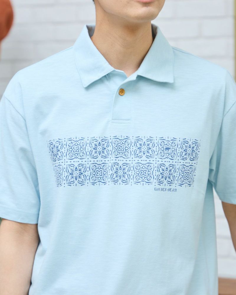 前身頃にプリントを施した共襟ポロシャツです。ナチュラルな表情のスラブ混天竺生地を使用しています。バンダナ柄をモチーフにしたプリントは存在感があり、1枚でも様になるポロシャツです。 モデル身長: 176 cm 着用サイズ: L サイズ Golden Bear Men's カットソー (Men's) 【着用アイテム】314R4730 超ストレッチパンツ 314R5701 スラックス
