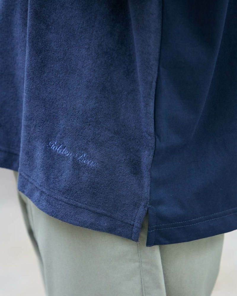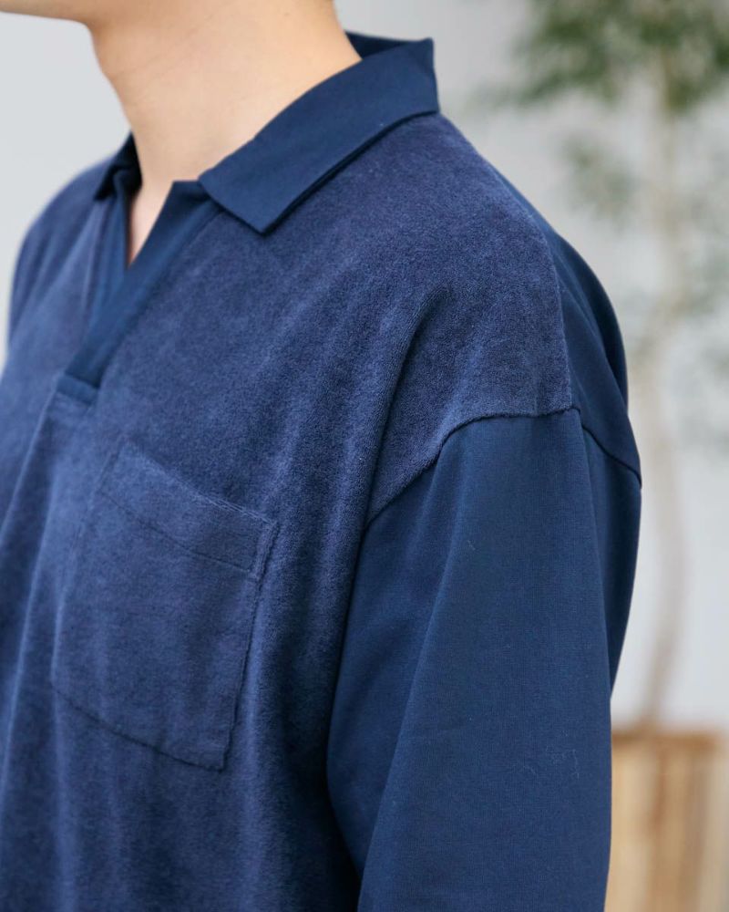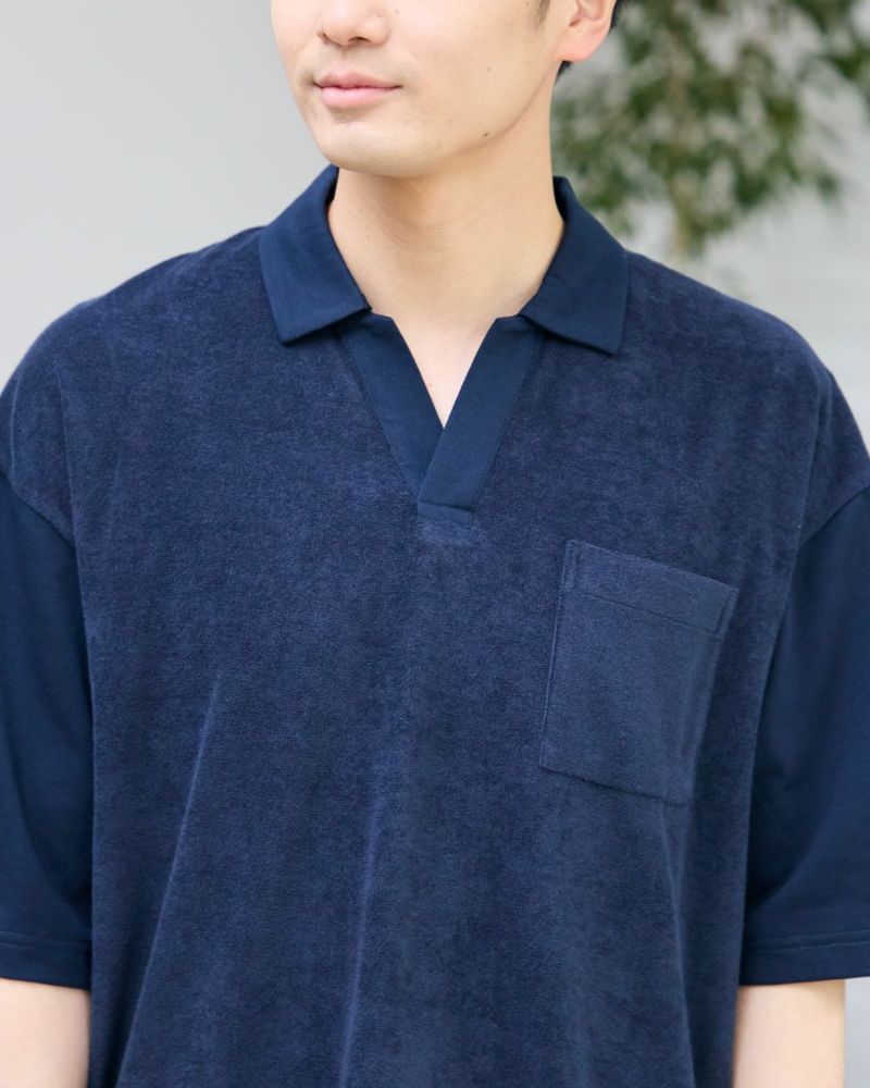 同色の異なる生地で切り替えたスキッパーポロシャツです。前身頃は表情のあるミニパイル地、袖・後身頃は天竺生地を使用しています。サイズ感はややゆったりとしたリラックスシルエットです。 モデル身長: 176 cm 着用サイズ: L サイズ Golden Bear Men's カットソー (Men's) 【着用アイテム】314R3704 超ストレッチパンツ 314R4710 イージーパンツ