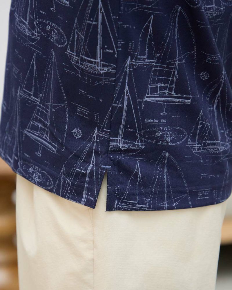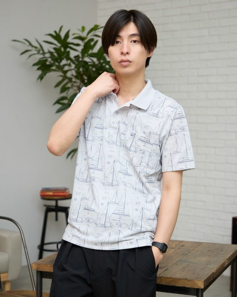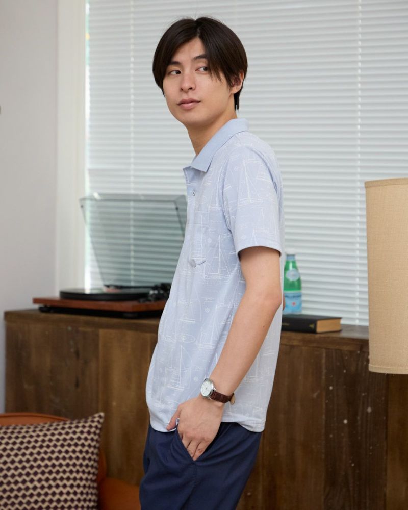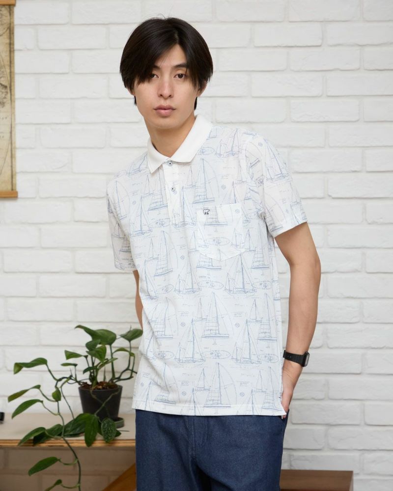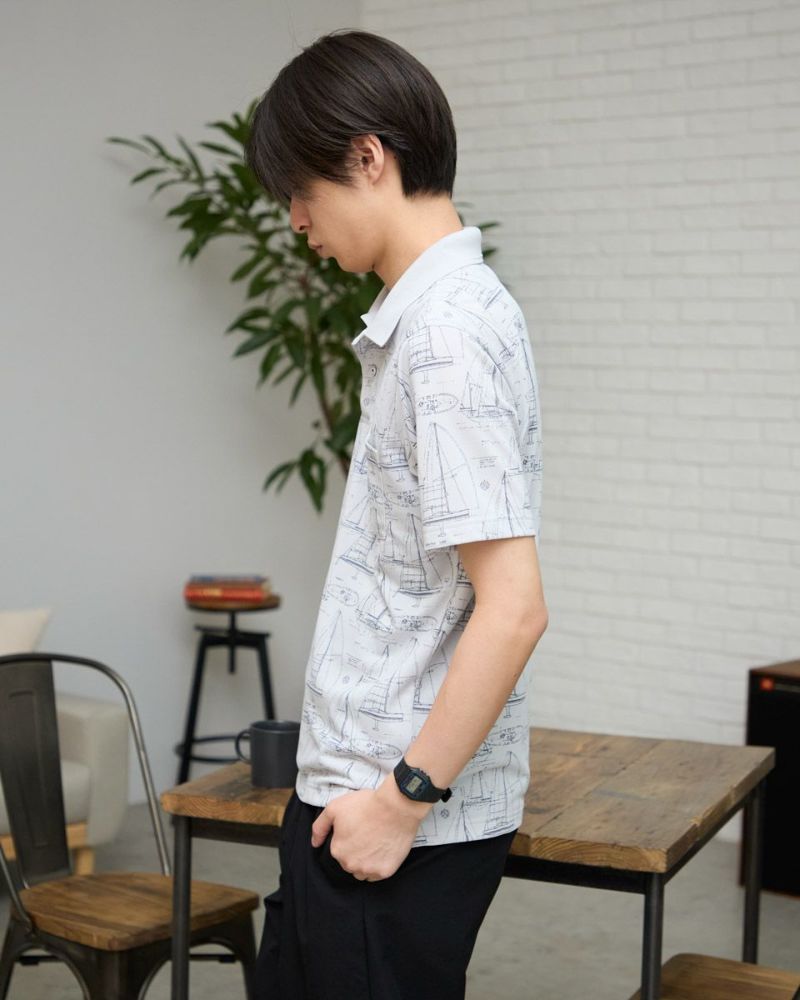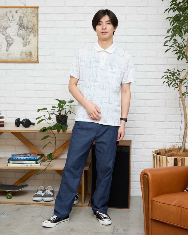 夏らしい海モチーフのプリントを施したポロシャツです。吸水速乾性に優れ、さらっとした着心地が特徴の鹿の子生地を使用しています。総柄プリントですが優しい配色で着回しのしやすさがポイントです。 モデル身長: 180 cm 着用サイズ: L サイズ Golden Bear Men's カットソー (Men's) 【着用アイテム】314R4730 超ストレッチパンツ 314R7710 ワイドイージーパンツ