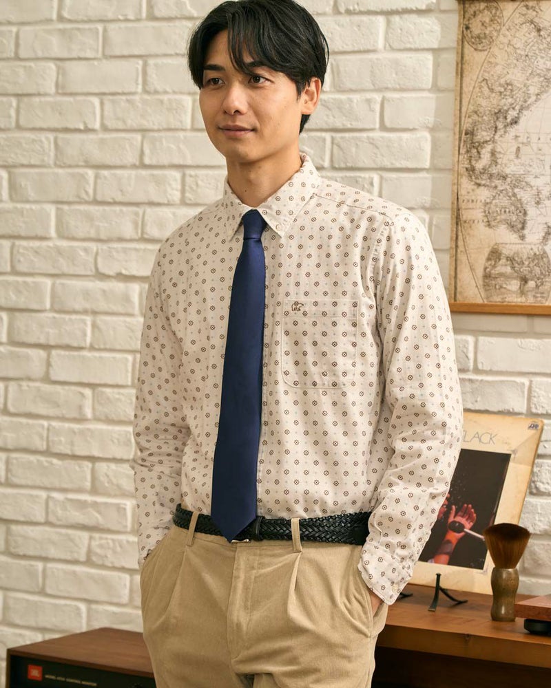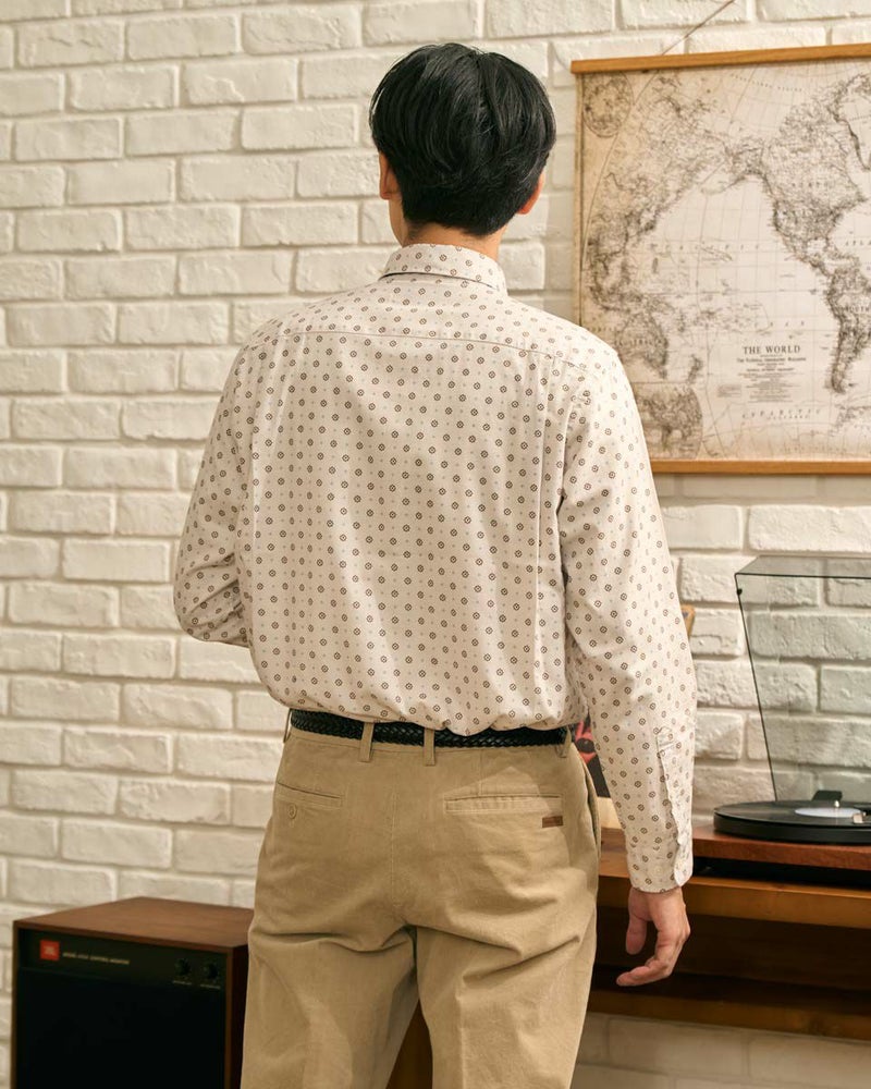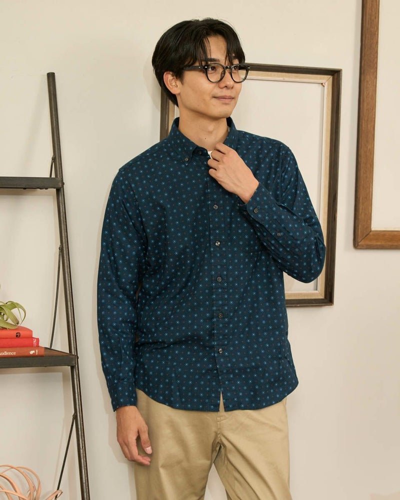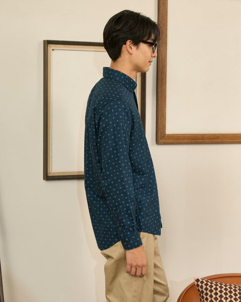 小紋柄のプリントを施したボタンダウン襟シャツです。起毛を施した綾織り生地は、暖かく柔らかな風合いが特徴です。ニットと合わせた上品なスタイリングがオススメです。