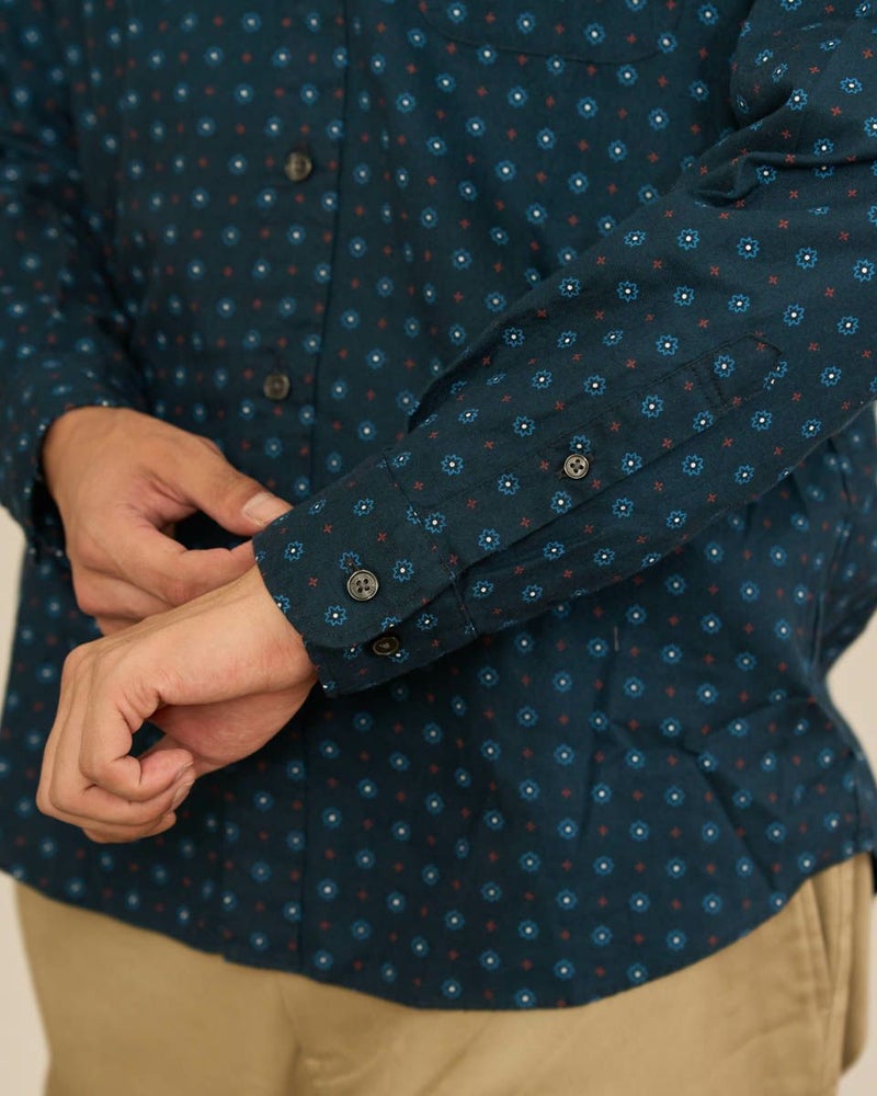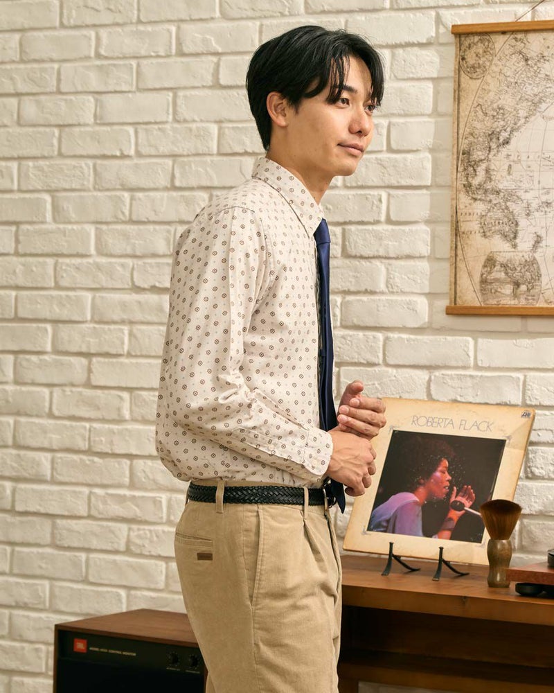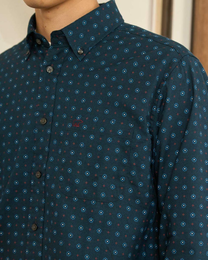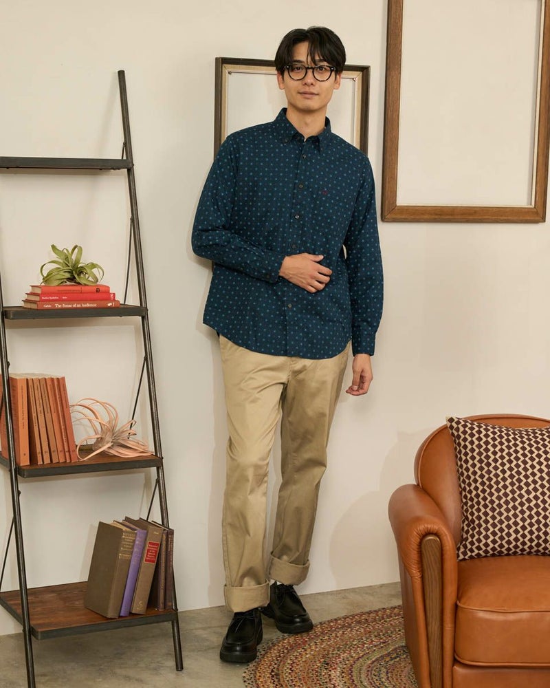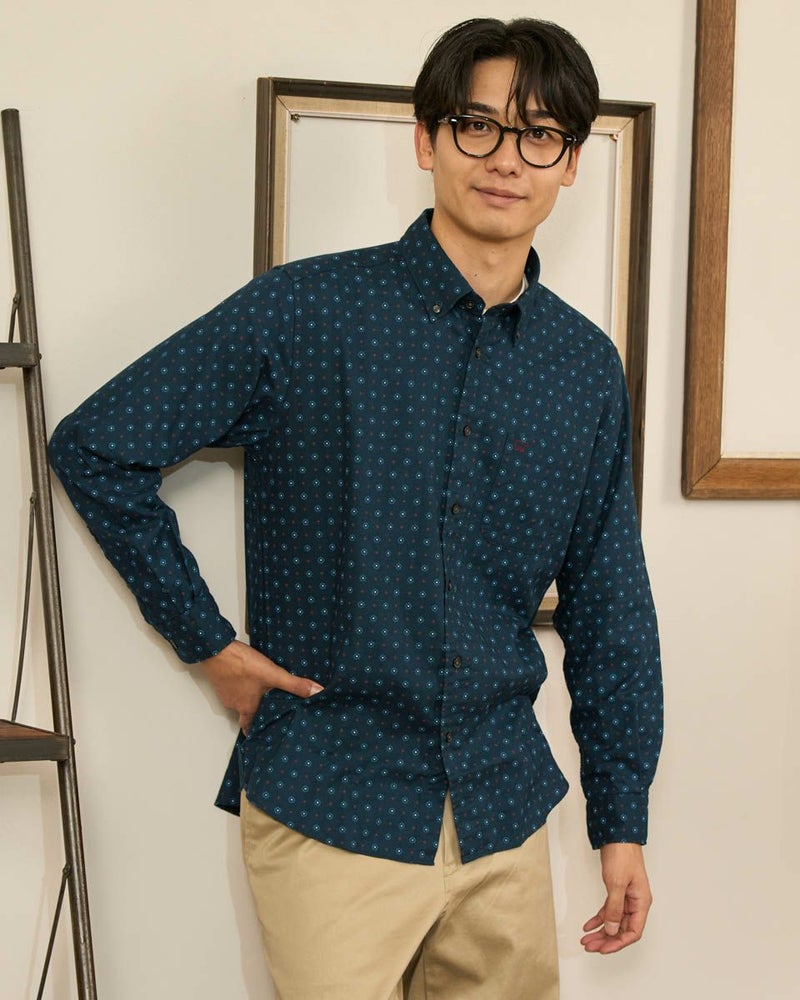 小紋柄のプリントを施したボタンダウン襟シャツです。起毛を施した綾織り生地は、暖かく柔らかな風合いが特徴です。ニットと合わせた上品なスタイリングがオススメです。