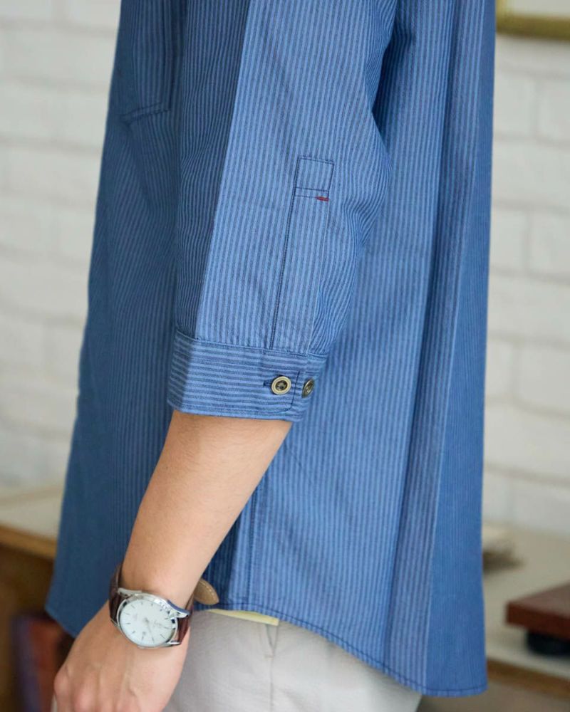 七分袖丈のシャツ羽織りです。同系色のストライプサッカー生地を使用しています。凹凸感があり、さらっとした着心地が特徴です。前身頃の豊富なポケットも実用的で魅力です。