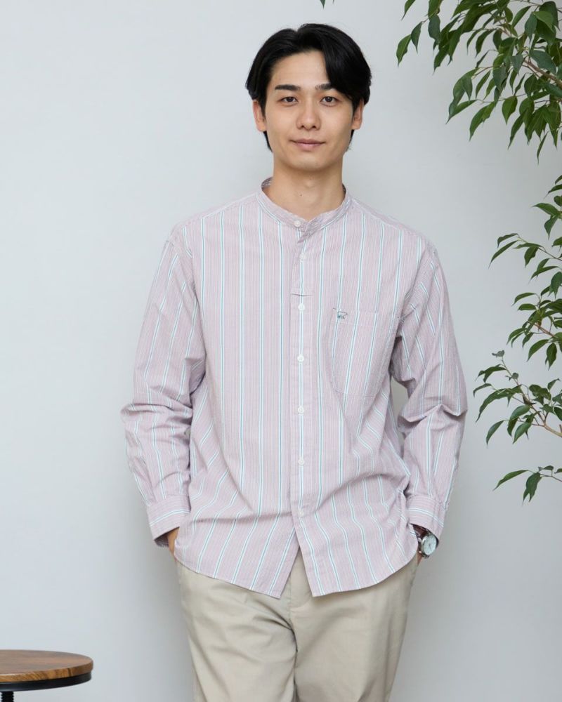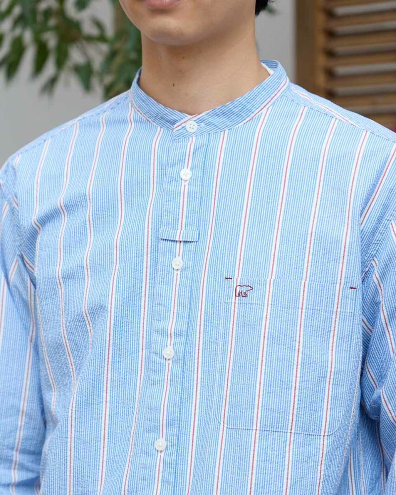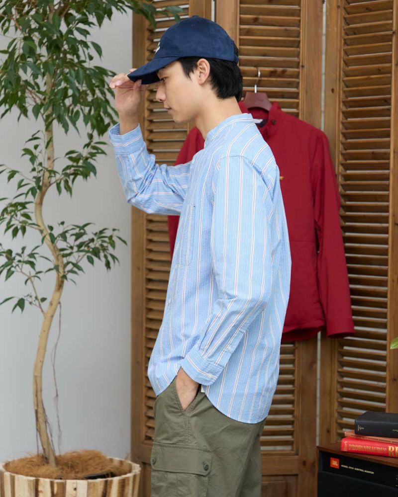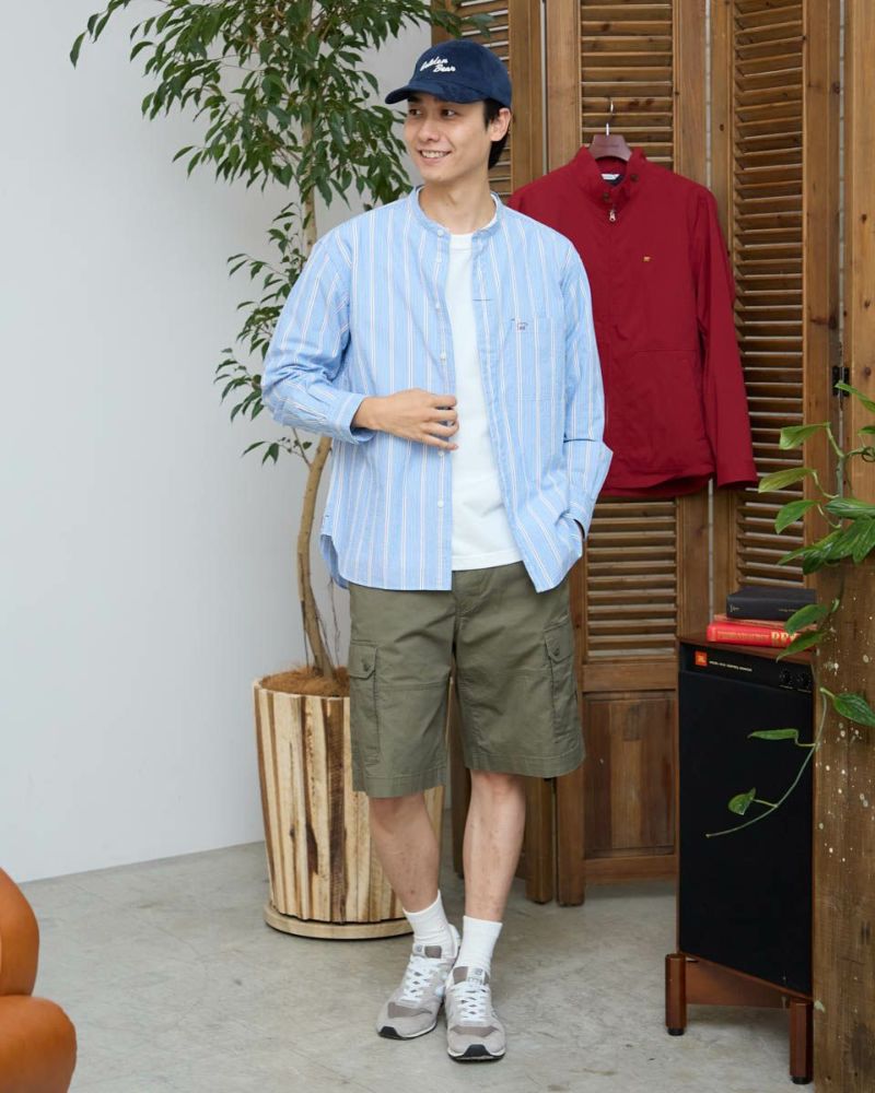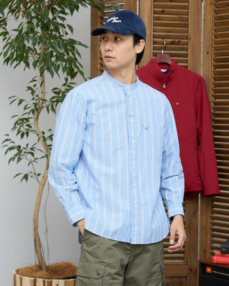ストライプのバンドカラーシャツです。強撚糸を使用したサッカー組織の生地です。肌離れがよく、さらっとした肌ざわりが特徴です。夏場は軽い羽織として、秋はインナーとしても活躍する万能なシャツです。 モデル身長: 180 cm 着用サイズ: L サイズ Golden Bear Men's シャツ (Men's) 【着用アイテム】314R8403 ラペルカーディガン 314R8430 GB天竺七分袖Tシャツ 314R7701 カーゴハーフパンツ 314R8703 イージーパンツ