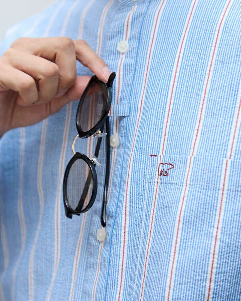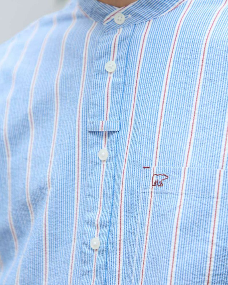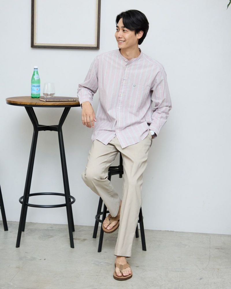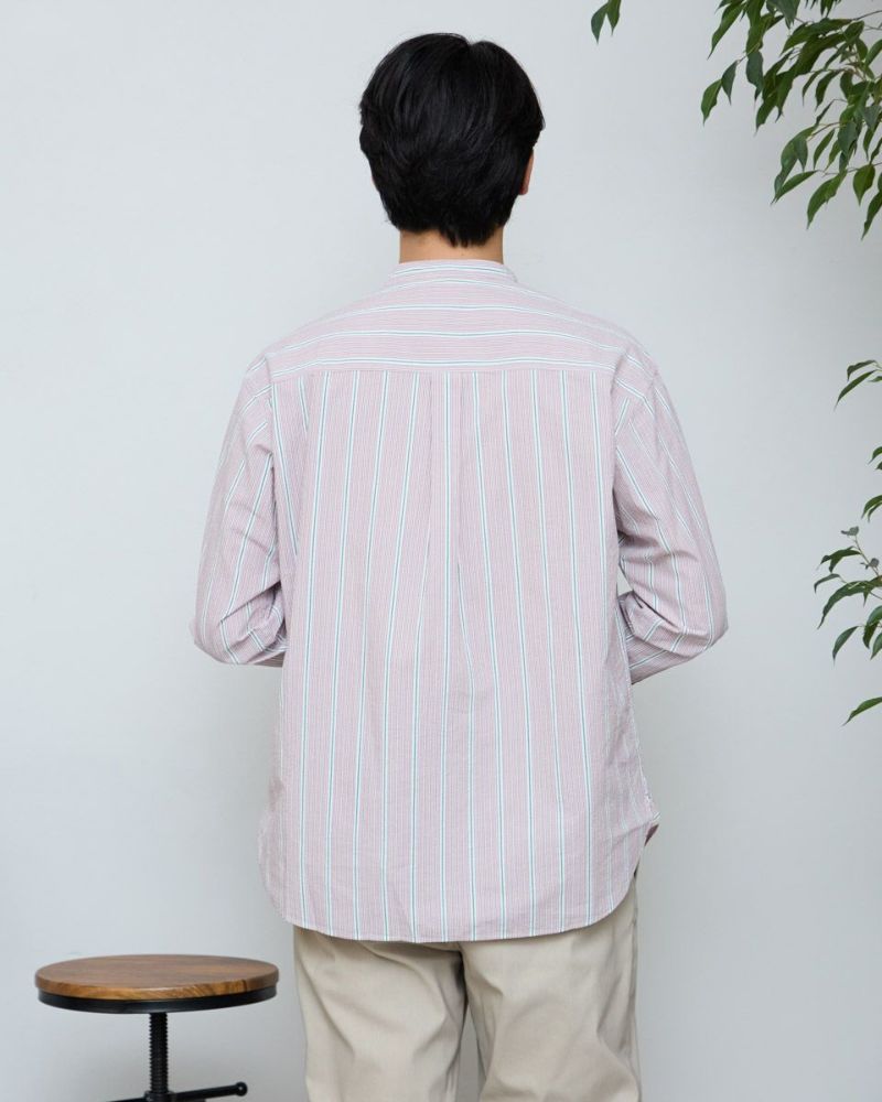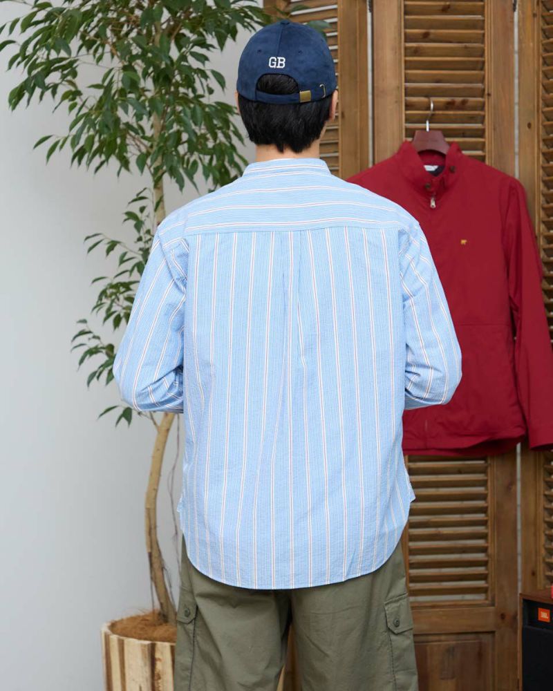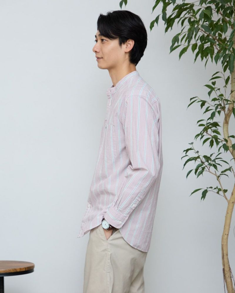 ストライプのバンドカラーシャツです。強撚糸を使用したサッカー組織の生地です。肌離れがよく、さらっとした肌ざわりが特徴です。夏場は軽い羽織として、秋はインナーとしても活躍する万能なシャツです。 モデル身長: 180 cm 着用サイズ: L サイズ Golden Bear Men's シャツ (Men's) 【着用アイテム】314R8403 ラペルカーディガン 314R8430 GB天竺七分袖Tシャツ 314R7701 カーゴハーフパンツ 314R8703 イージーパンツ