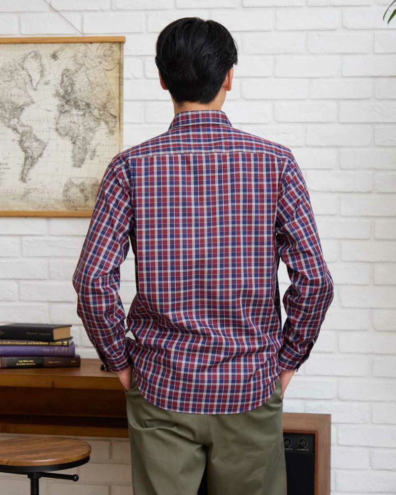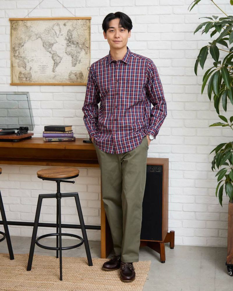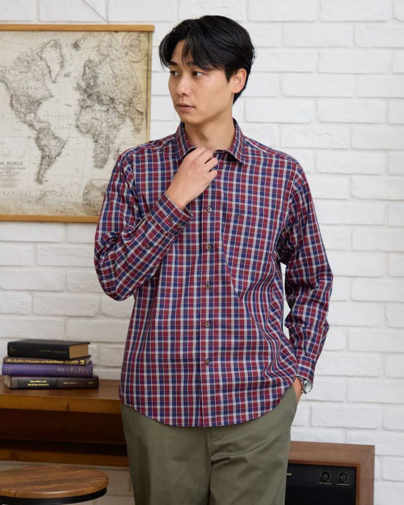 トラッドスタイルを品良く仕上げるタータンチェックのレギュラーカラーシャツです。 ポリエステルの糸を芯に、 綿糸でカバーリングしたコアヤーンを使用。60の細番手の糸をオックス組織で高密度に織り上げることで、光沢感と繊細な表面感に仕上げました。イージーケア加工でシワを気にせず着用いただけます。 モデル身長: 180 cm 着用サイズ: L サイズ Golden Bear Men's シャツ (Men's) 同デザイン大きい(3Lサイズ)はこちら 【着用アイテム】314R8102 ドライビングジャケット 314RC130 デニムカバーオール 314RC704 イージーパンツ