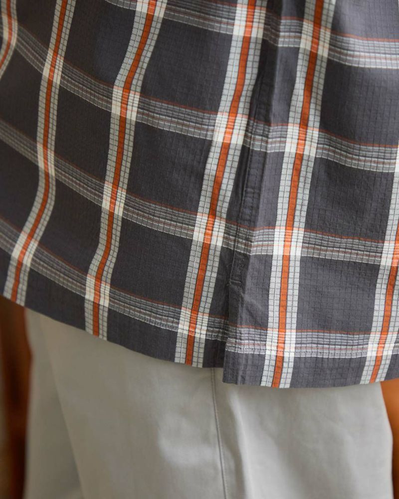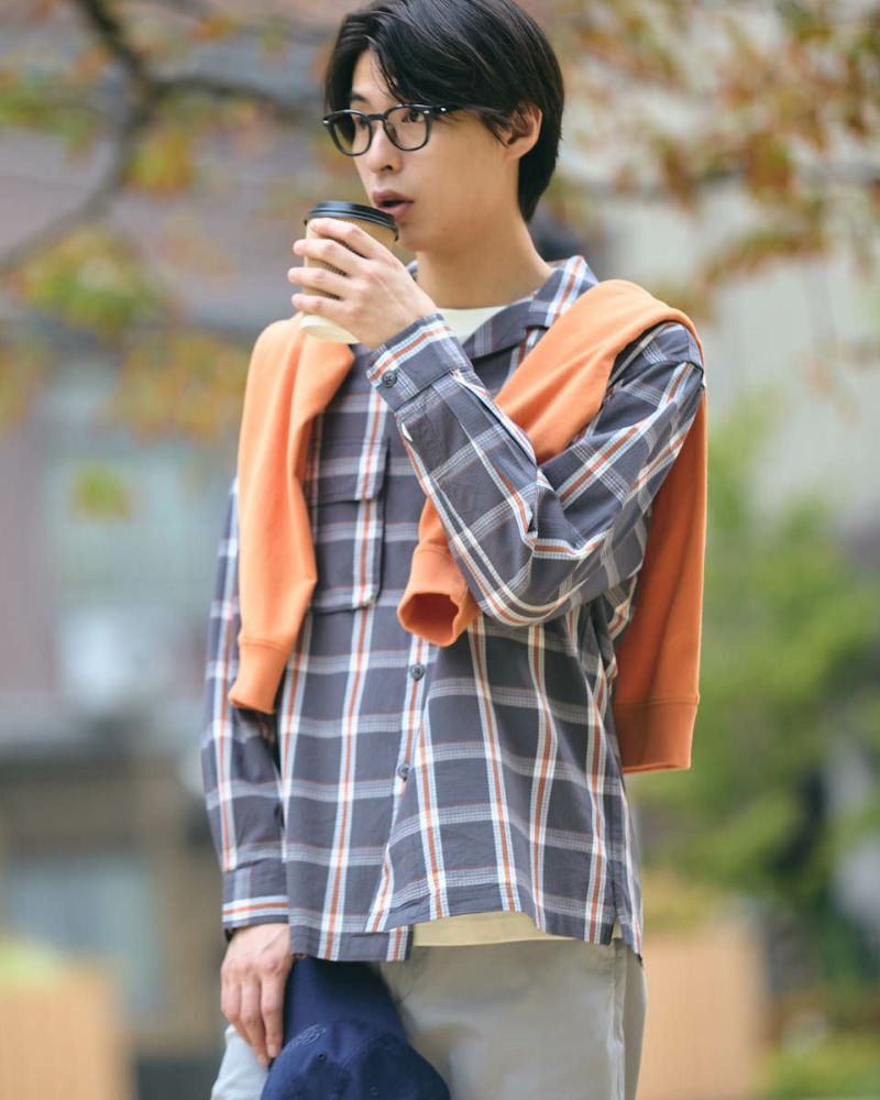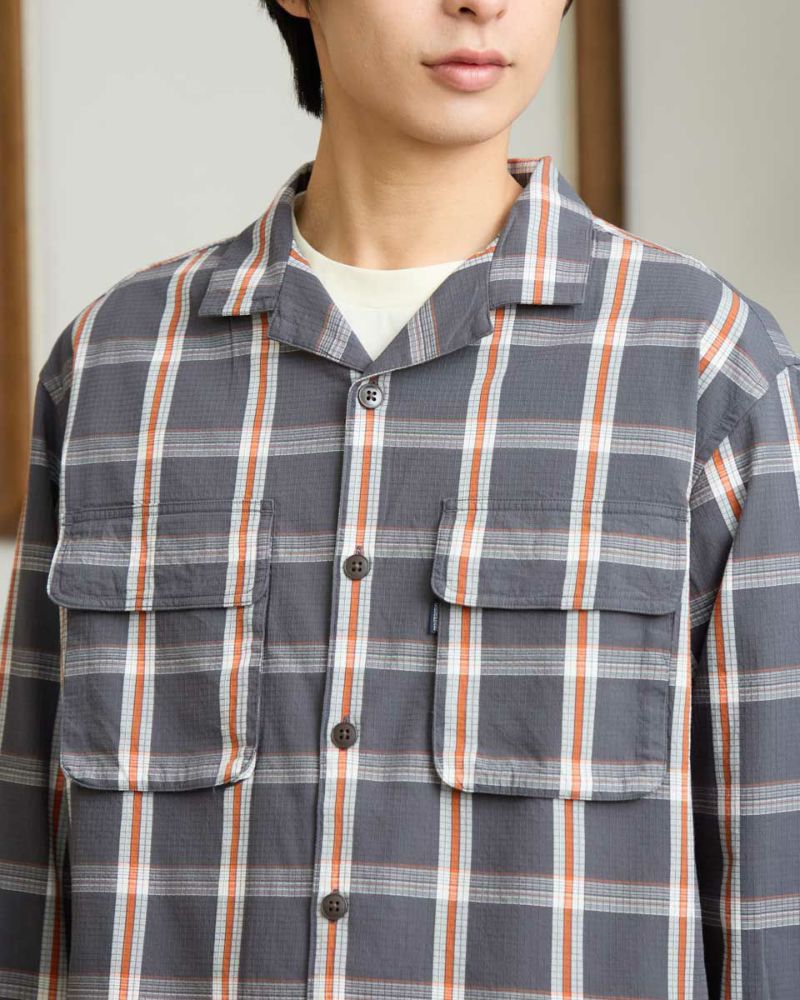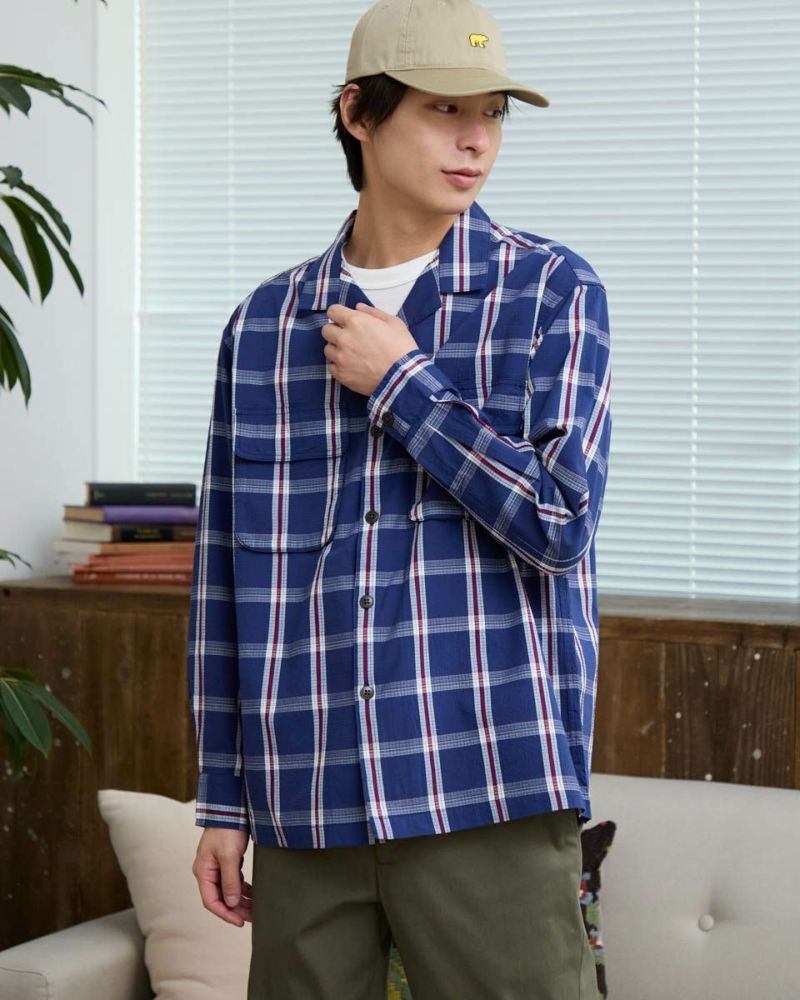 リップストップのような格子地柄が入ったオープンカラーシャツです。心地よいハリ感と色合いがスポーティーな印象を与える大柄チェックです。ややゆったりとしたサイズ感です。Tシャツの上に羽織るカジュアルスタイルがおすすめです。実用性とデザイン性を兼ね備えた大きめのマチ付きフラップポケットがポイントです。 モデル身長: 180 cm 着用サイズ: L サイズ Golden Bear Men's シャツ (Men's) 【着用アイテム】314RC003 ウォッシュキャップ 314RC414 ハーフZIPスウェット 314RC704 イージーパンツ