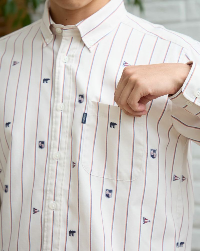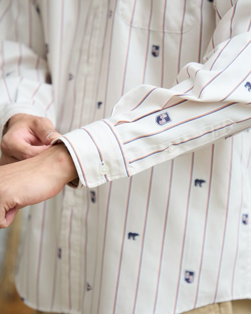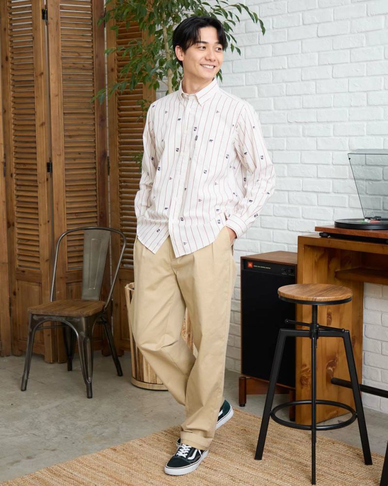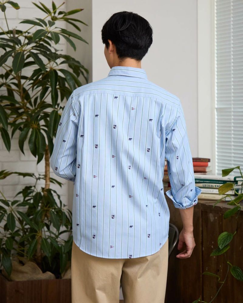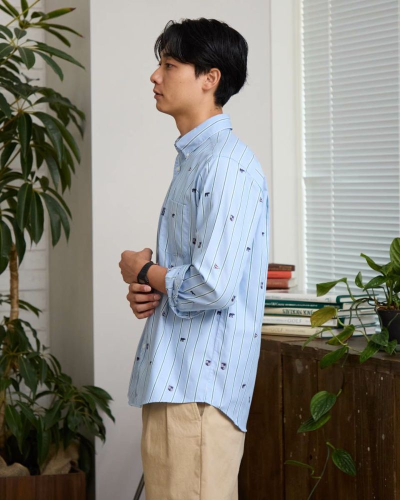 アイコンをカットジャカード柄で表現したストライプシャツです。 ジャカードで柄を表現しているので立体的な表情がありコーディネイトが華やぐ一枚です。すっきりしたストライプがベースで様々なスタイルに合わせやすいのが特徴です。特に紺ブレなどと合わせたプレッピースタイルがおすすめです。 モデル身長: 180 cm 着用サイズ: L サイズ Golden Bear Men's シャツ (Men's) 【着用アイテム】314RC470 トラックジャケット 314RC700 ワイドチノ