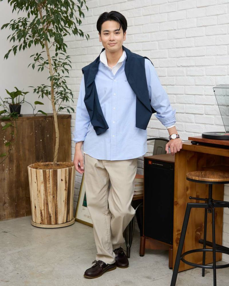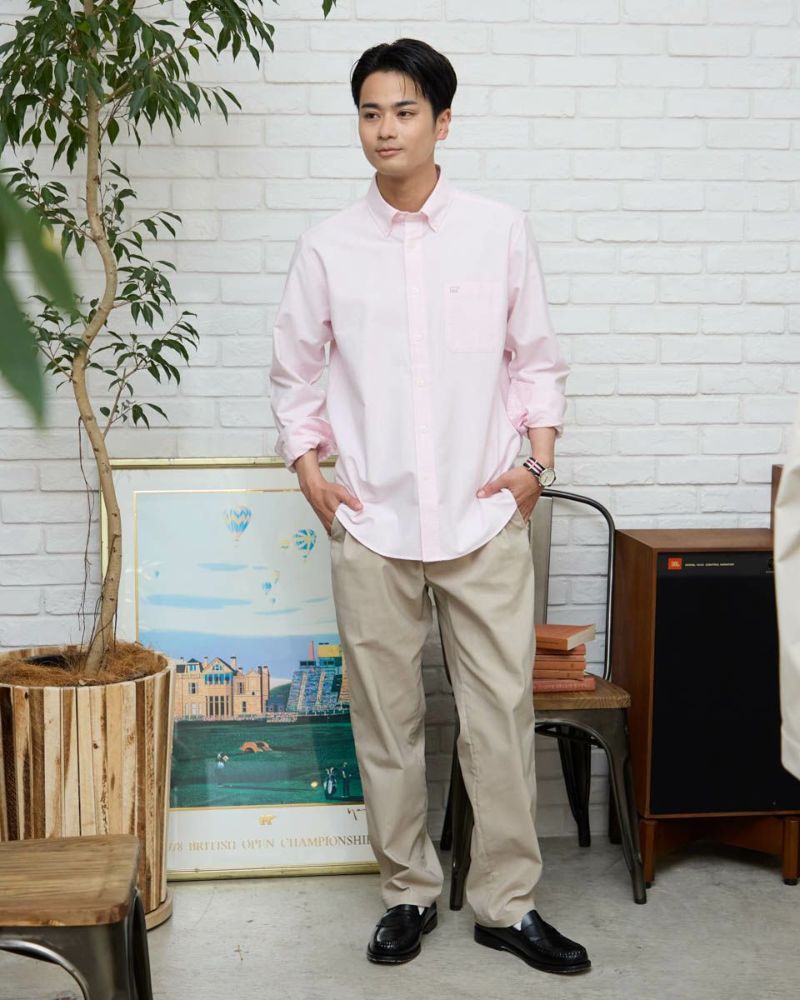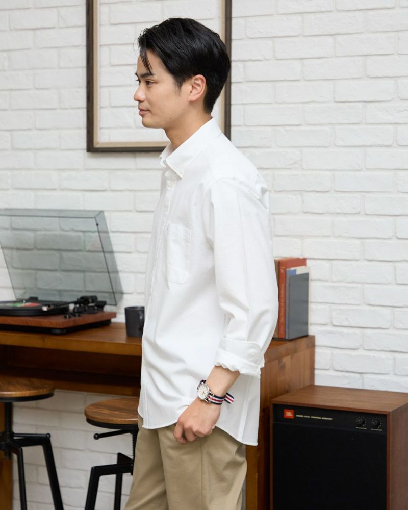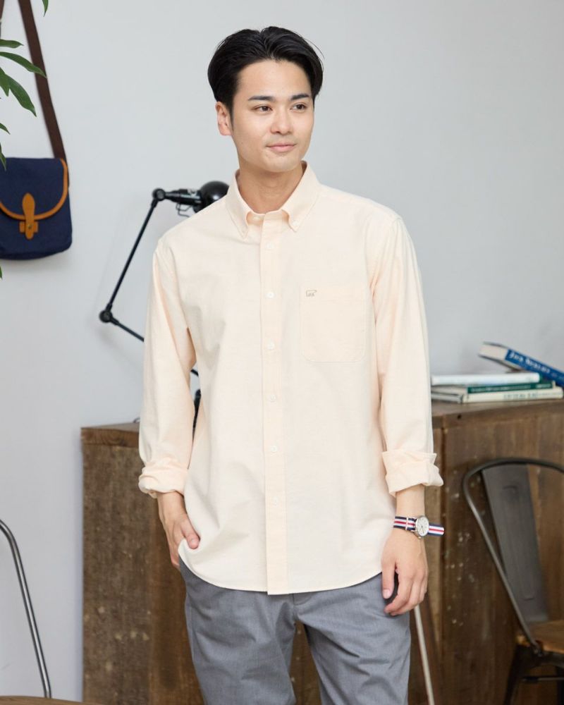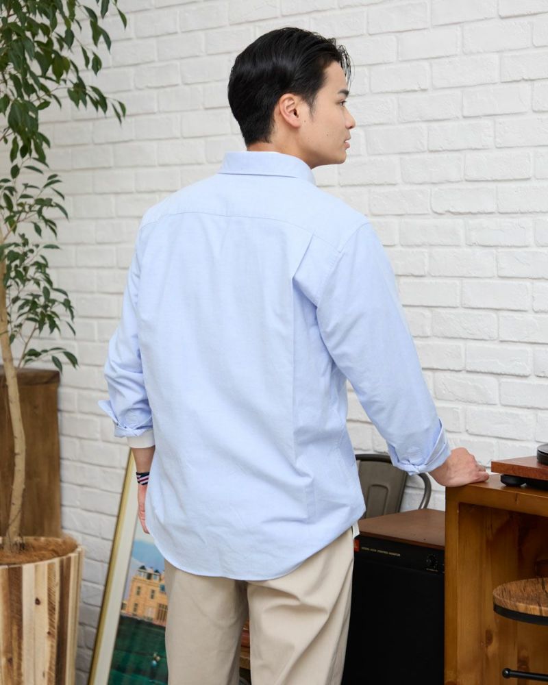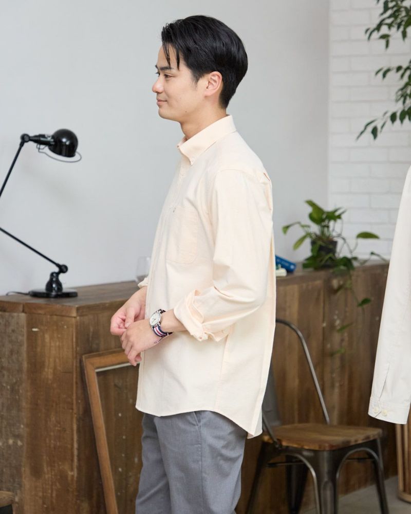 ボタンダウン襟のオックスシャツです。生地は緯糸に太番手を使用し肉感があり、表面にピーチ起毛をかけ製品柔軟洗いをかけることでふっくらとした柔らかな風合いに仕上げました。お洗濯後のアイロンがけが大変・・・なんてこと、ありますよね?イージー加工を施していますのでお手入れが簡単です。ホワイト、ピンク、クリーム、サックスのカラーバリエーション。迷ったらこれ!と言える万能アイテムです。一枚持っているだけで、毎日のコーディネートがぐっと楽になります。 モデル身長: 176 cm 着用サイズ: L サイズ Golden Bear Men's シャツ (Men's) レディースサイズはこちら 【着用アイテム】317RC101 ブレザー 314RC412 ラガーシャツ 314R8452 長袖ポロシャツ 314R8701 チノパン 314R8703 イージーパンツ