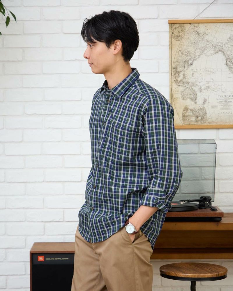 トラッドスタイルを品良く仕上げるタータンチェックのレギュラーカラーシャツです。 ポリエステルの糸を芯に、 綿糸でカバーリングしたコアヤーンを使用。60の細番手の糸をオックス組織で高密度に織り上げることで、光沢感と繊細な表面感に仕上げました。イージーケア加工でシワを気にせず着用いただけます。 モデル身長: 180 cm 着用サイズ: L サイズ 同デザイン通常サイズはこちら Golden Bear KING SIZE(Men's 大きいサイズ) シャツ (Men's) 【着用アイテム】314R8102 ドライビングジャケット 314RC130 デニムカバーオール 314RC704 イージーパンツ