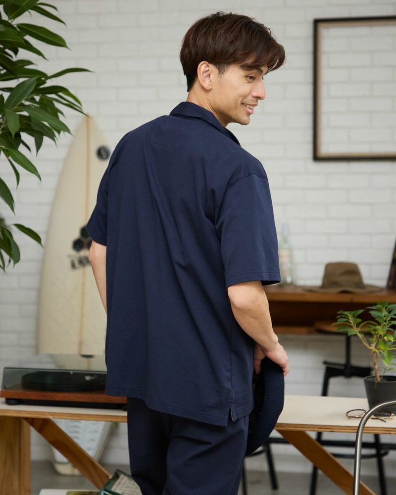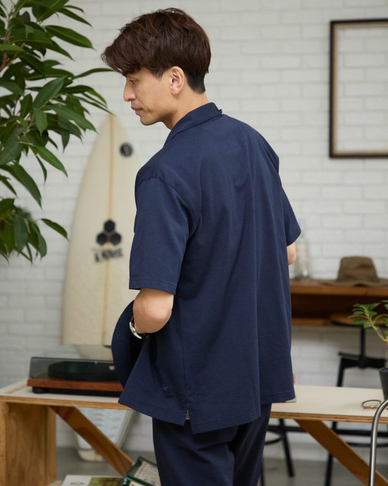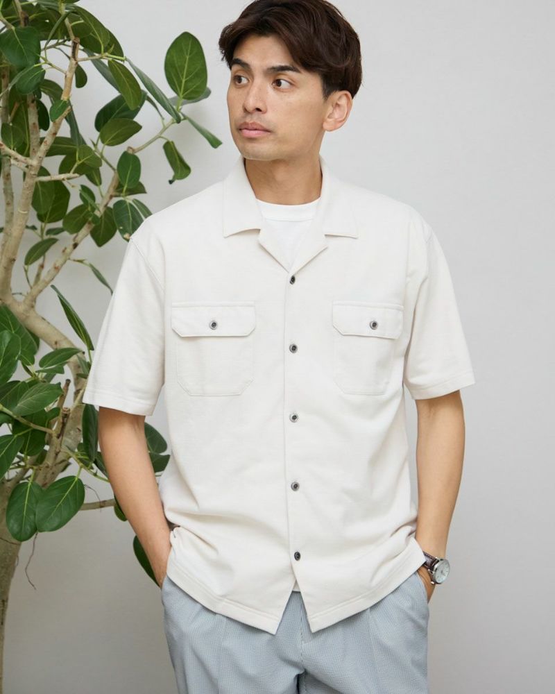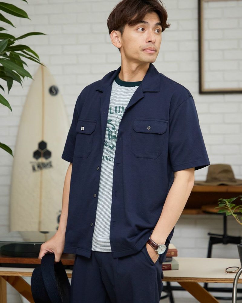 軽く羽織れる前開きの半袖シャツです。 吸水速乾性に優れたワッフル鹿の子生地を使用しています。胸のダブルポケットがアクセント。リラックスシルエットに仕上げました。カットソー生地の羽織りならではの着心地のよさがポイントです。